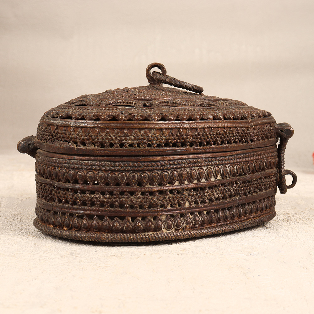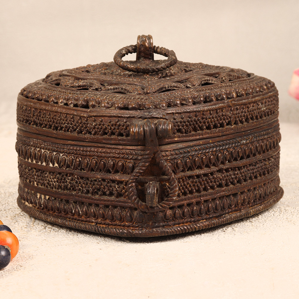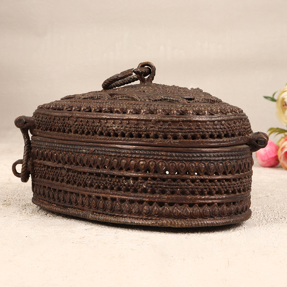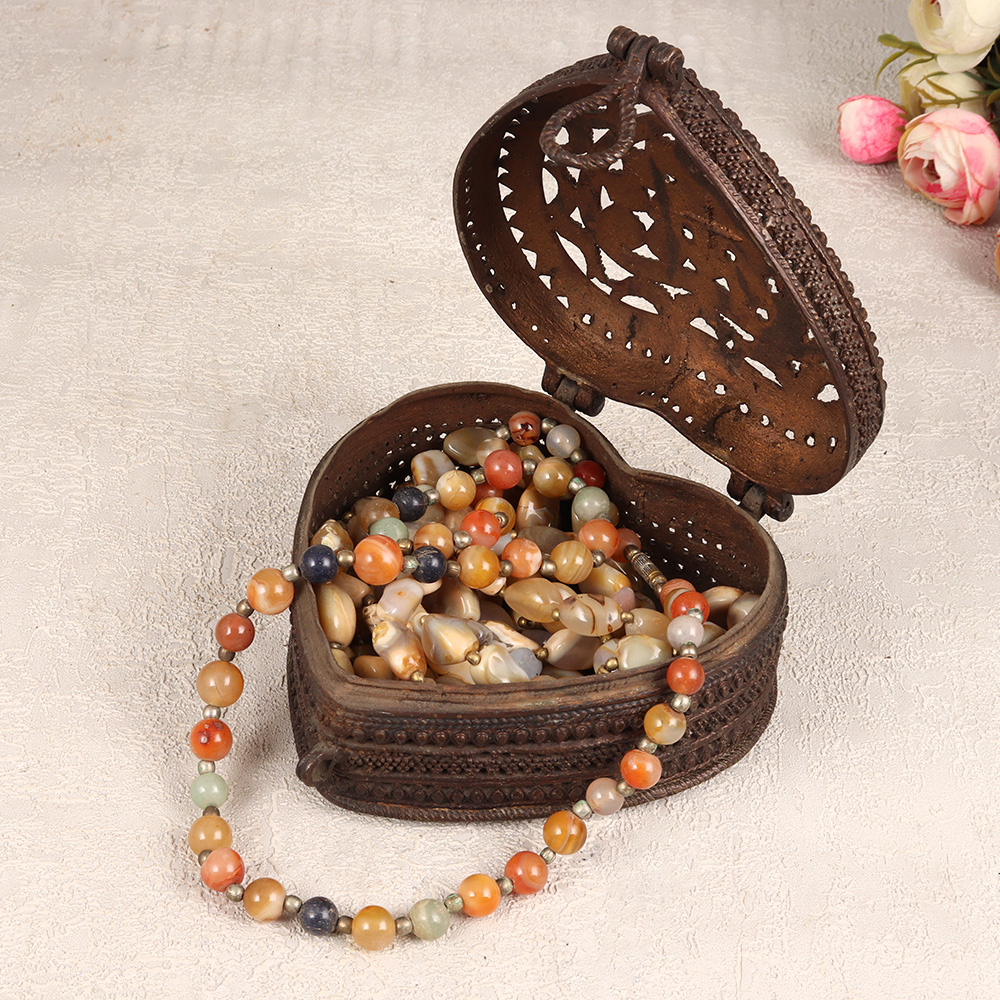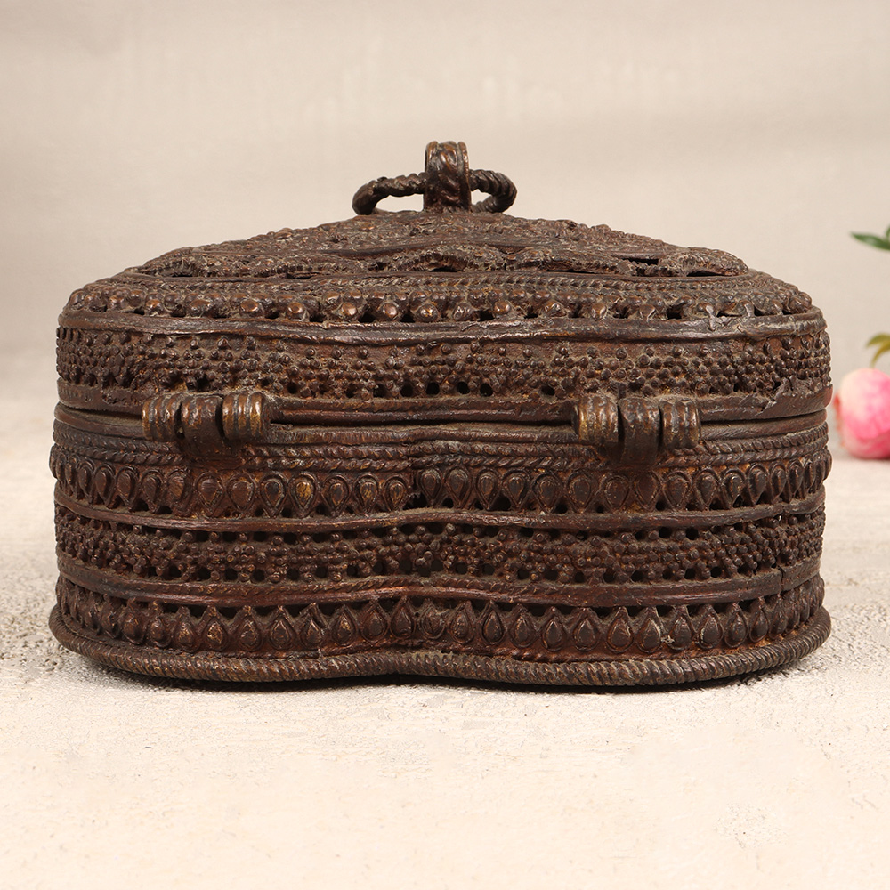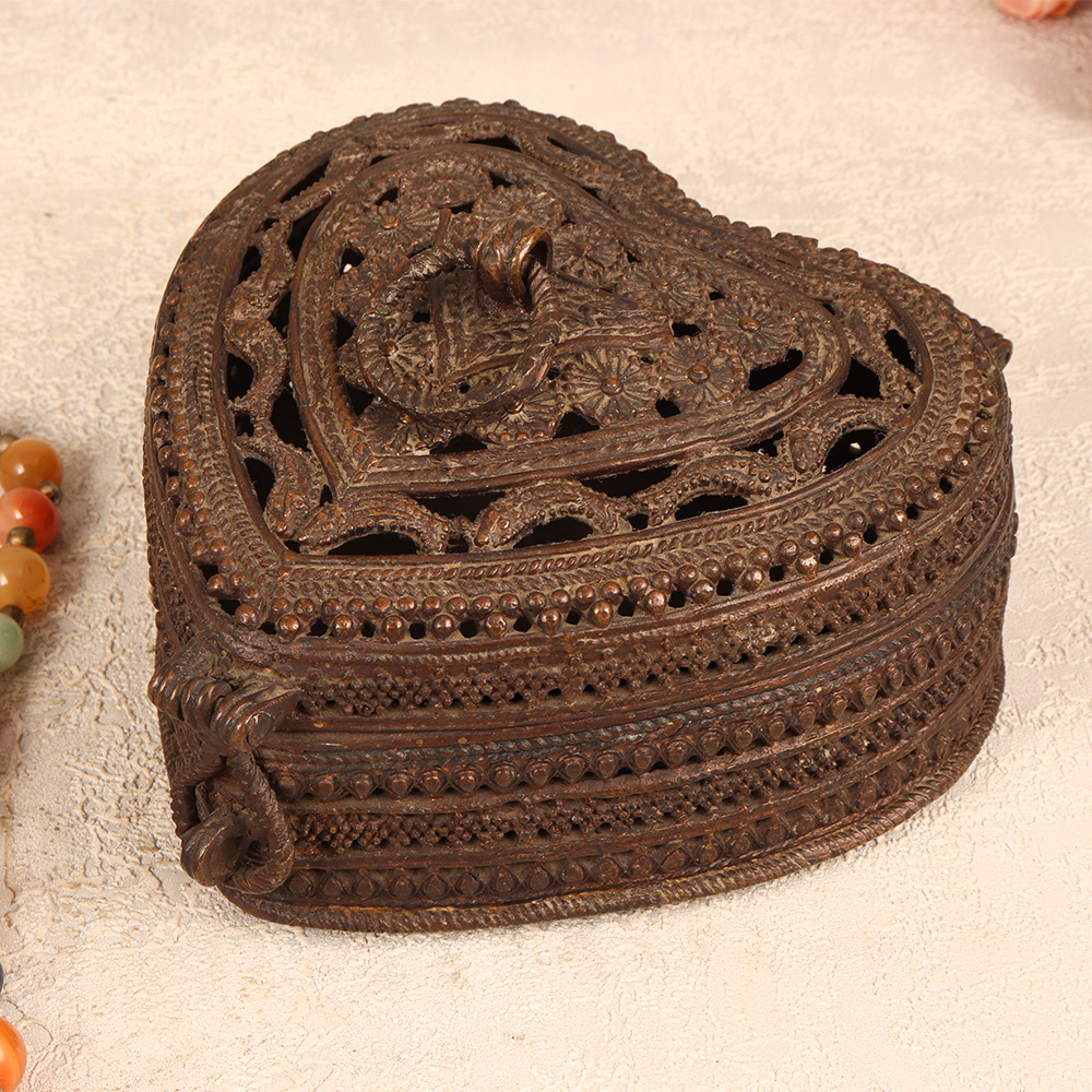 Immerse yourself in the allure of timeless craftsmanship with our exquisite Vintage Brass Heart-Shaped Jewelry Box. This enchanting piece is adorned with intricate jali work and delicate engravings that reflects the rich heritage of Odisha Art. Meticulously handcrafted by highly talented Indian artisans, this jewelry box is a testament to their craftsmanship and attention to detail. The heart-shaped design, coupled with a secure latch, makes it an ideal storage solution for precious stones and jewelry. Its antique dark finish adds a touch of old-world charm, making it a perfect addition to your home, office, restaurant, hotel, or cafe for both functional use and decorative appeal. Whether you're a collector seeking a distinctive piece or looking for a thoughtful gift, this jewelry box is a timeless expression of love and tradition, perfect for special, festive, or auspicious occasions.