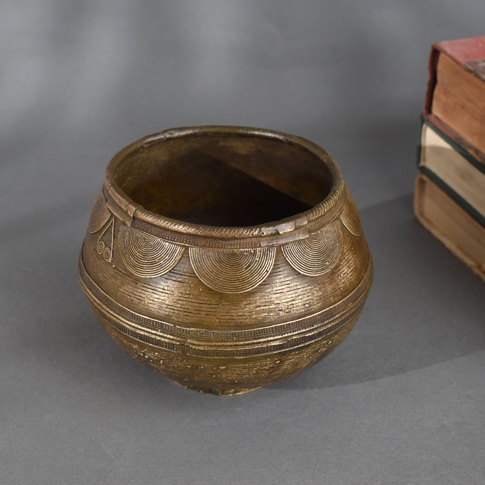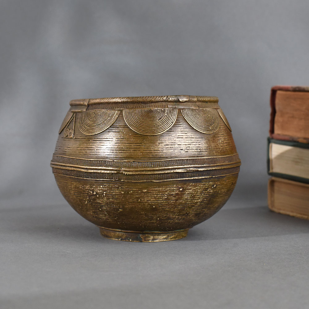 - Handcrafted brass pot with circular and linear etched patterns