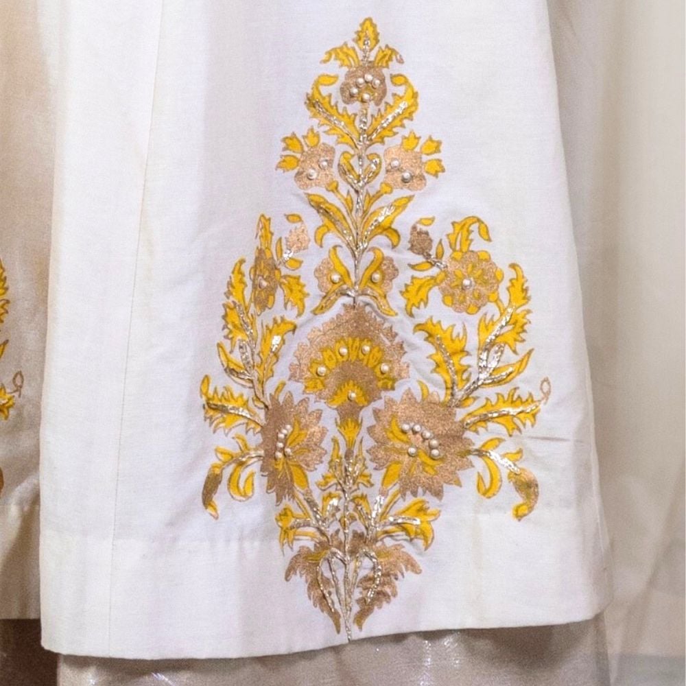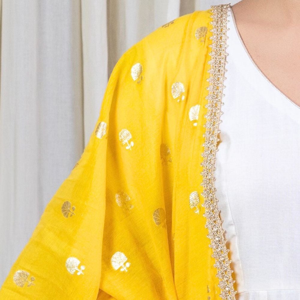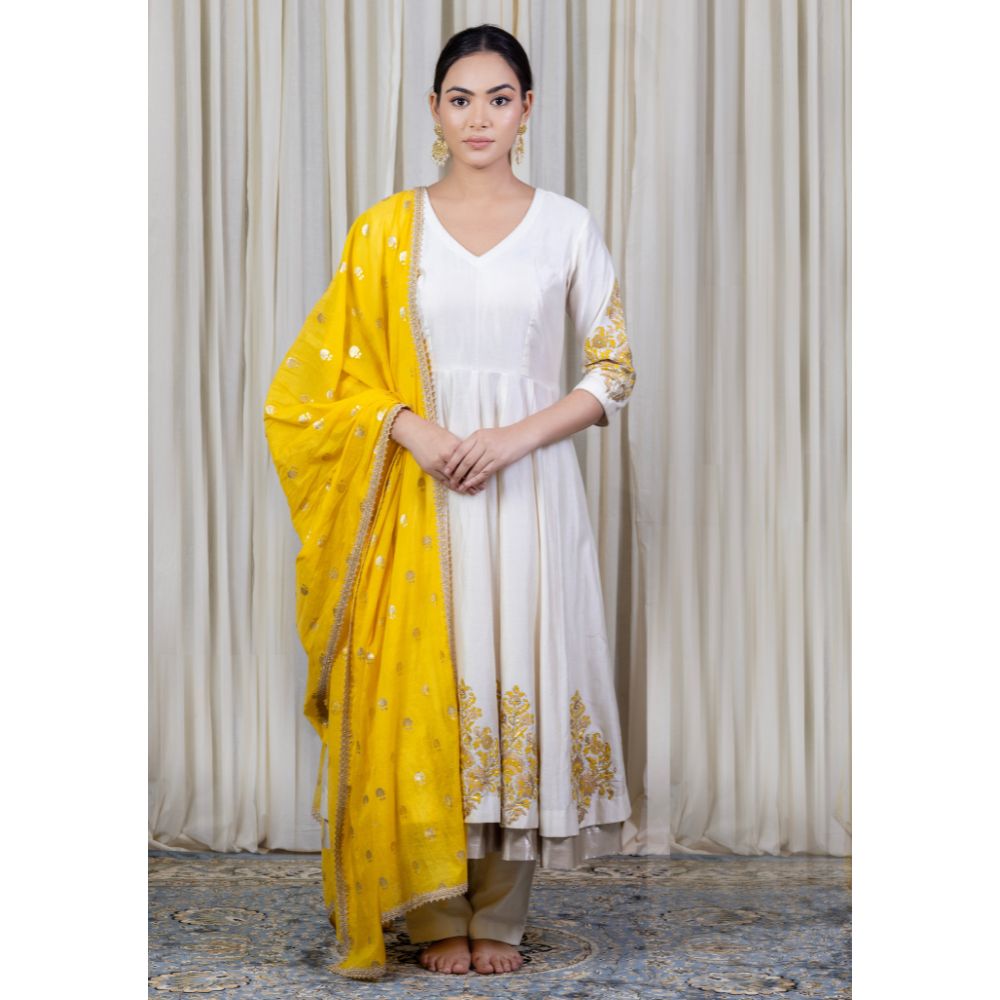 Radiate classic charm in this Off-White Anarkali Set with Hand Embroidery, crafted from luxurious pure cotton Chanderi and adorned with delicate hand block prints. The Anarkali features a graceful V-neckline and gathered flare, enhanced by intricate embroidery on the sleeves and hem that adds a regal touch to this minimalist silhouette. The soft off-white hue offers timeless elegance, making it ideal for daytime festivities, pujas, or pre-wedding functions. Paired with a breathable cotton bottom, the set ensures all-day comfort without compromising on style. A vibrant yellow viscose organza dupatta completes the ensemble, detailed with golden embroidery and a scalloped trim that adds a pop of festive flair. This handcrafted outfit beautifully balances subtle sophistication with festive energy, making it a must-have in every modern ethnic wardrobe. Style it with jhumkas and traditional footwear to make a stunning impression at any celebration.