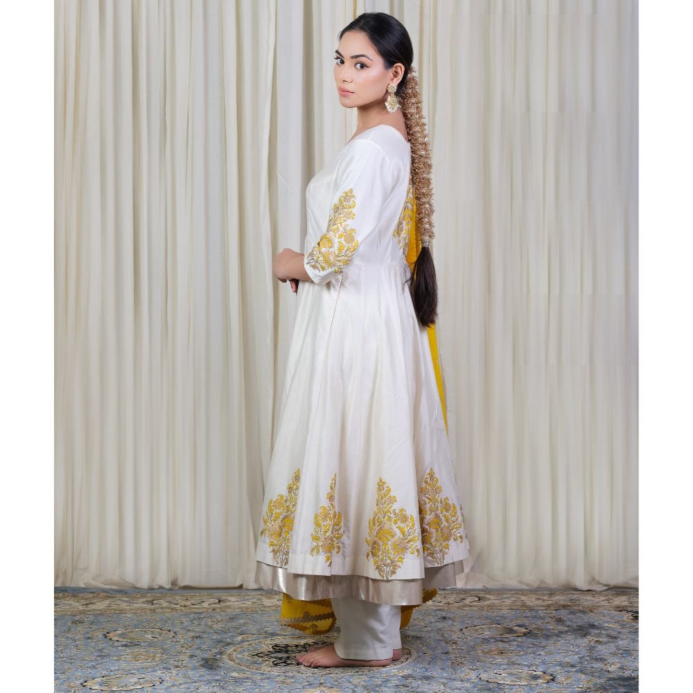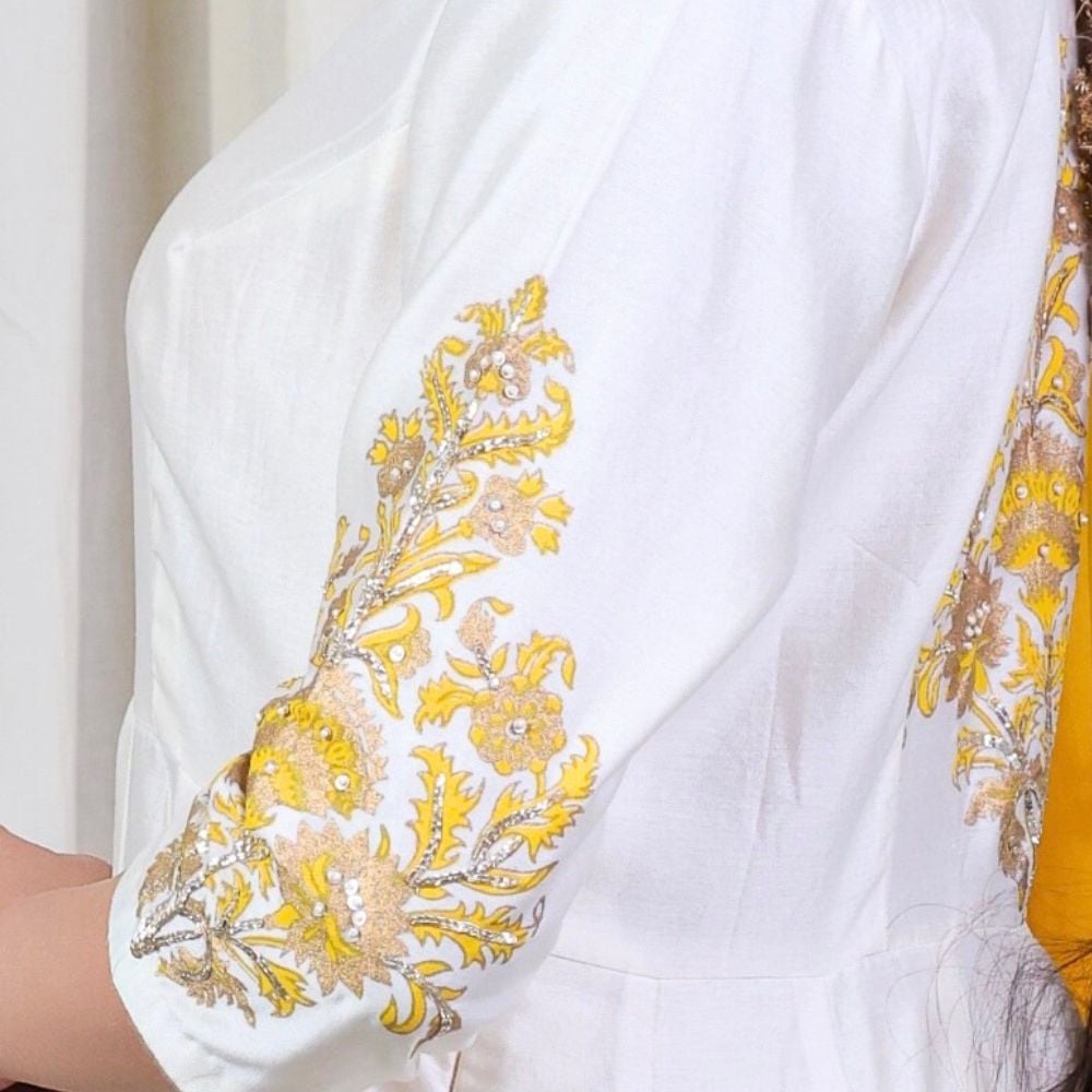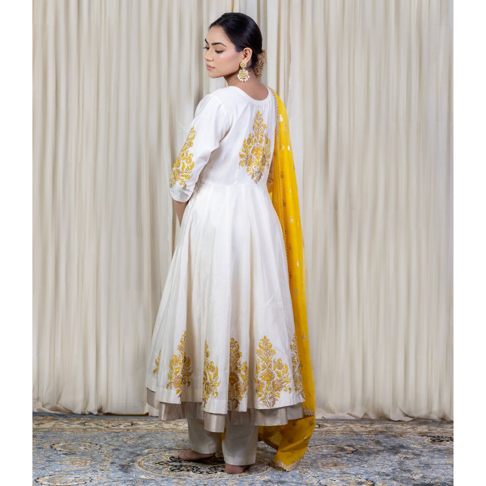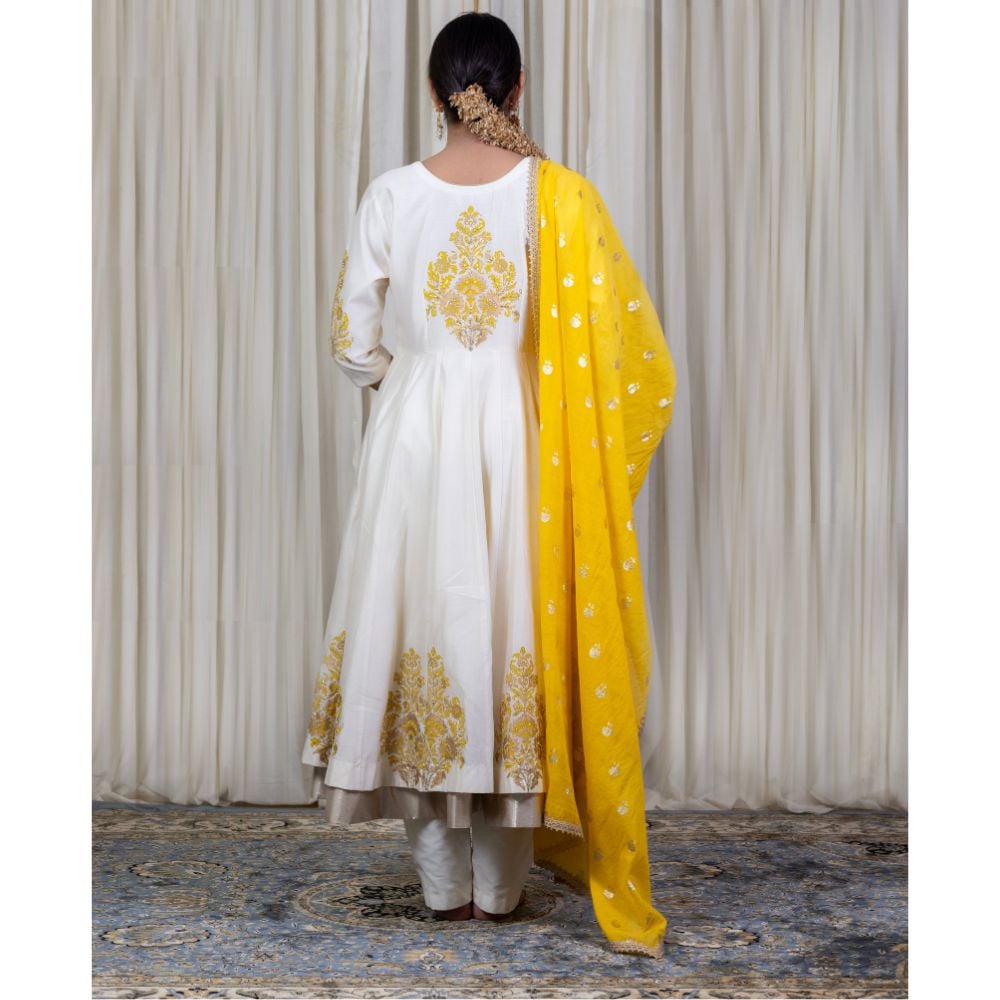 Radiate classic charm in this Off-White Anarkali Set with Hand Embroidery, crafted from luxurious pure cotton Chanderi and adorned with delicate hand block prints. The Anarkali features a graceful V-neckline and gathered flare, enhanced by intricate embroidery on the sleeves and hem that adds a regal touch to this minimalist silhouette. The soft off-white hue offers timeless elegance, making it ideal for daytime festivities, pujas, or pre-wedding functions. Paired with a breathable cotton bottom, the set ensures all-day comfort without compromising on style. A vibrant yellow viscose organza dupatta completes the ensemble, detailed with golden embroidery and a scalloped trim that adds a pop of festive flair. This handcrafted outfit beautifully balances subtle sophistication with festive energy, making it a must-have in every modern ethnic wardrobe. Style it with jhumkas and traditional footwear to make a stunning impression at any celebration.