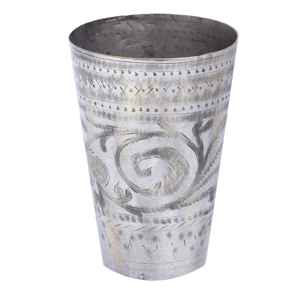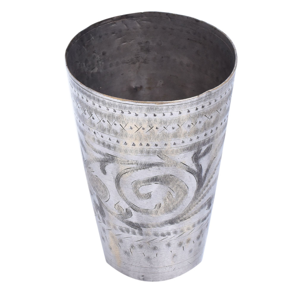 Vintage hand carved old north indian lassi glass or cup make wonderful vases or beakers to store paint brushes or kitchen utensils because they are sturdy heavy and unique and are great for home décor and personal gifting. It has a lovely swirl pattern in nickel finish.
