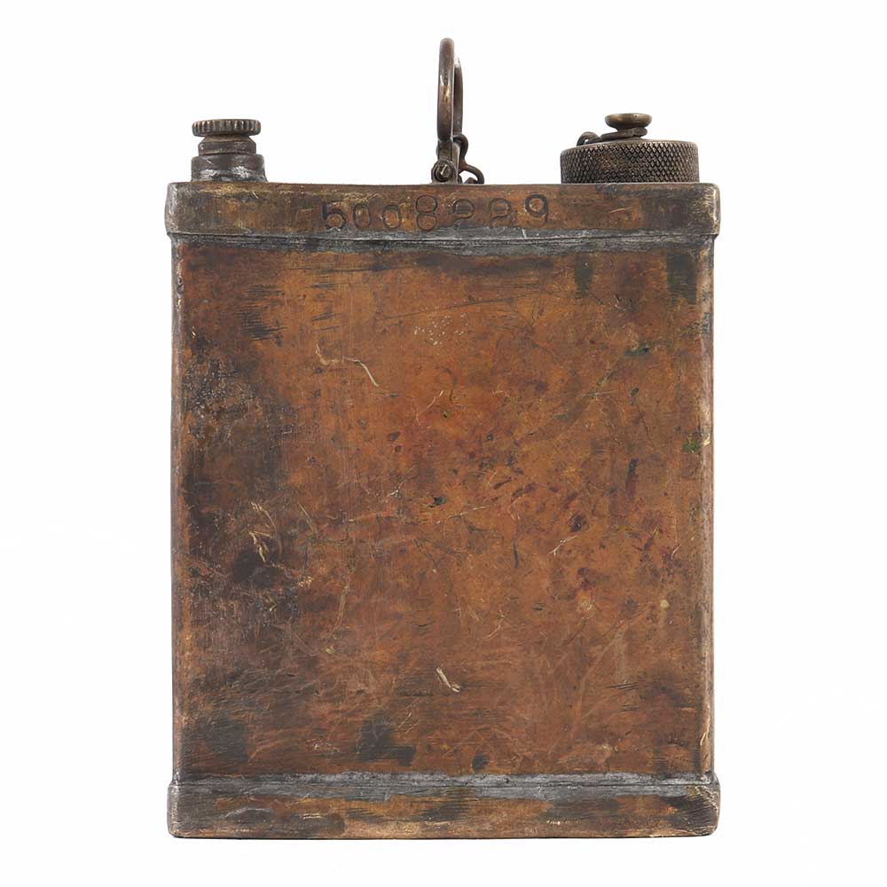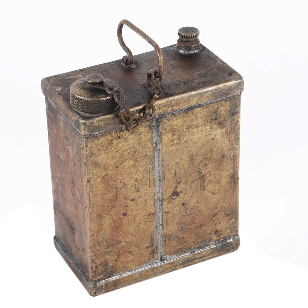 Primitive Petrol tin can with brass cap that has been drained and cleaned and is actually extremely ancient with thick patina that shows wear and tear. A true collector's item that is ideal for both collection and gifting.