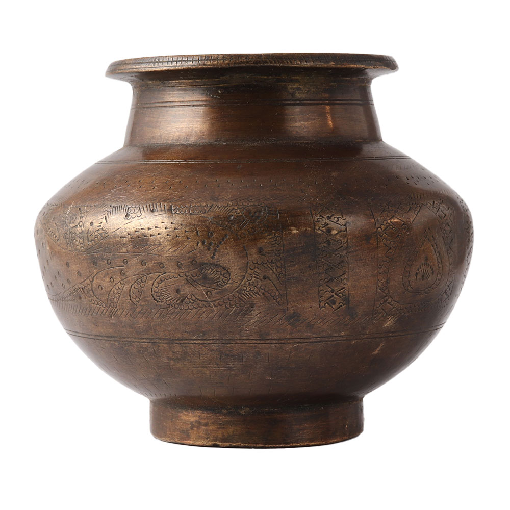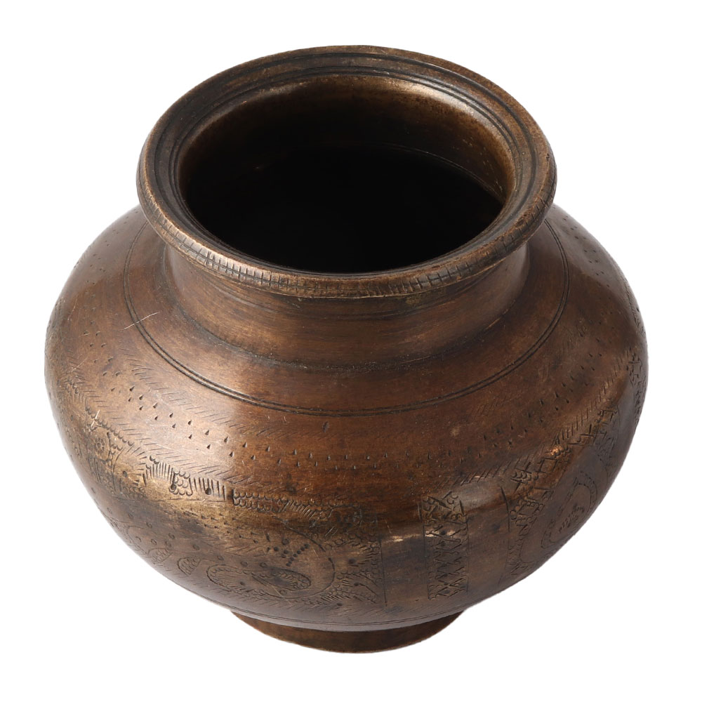 A unusual and beautiful brass water pot with etched floral design. It also has other decorative carvings like circles, diamonds, and parts. To complete the effect, there are extra circular borders with various patterns. In temples and other religious buildings, it is used to store holy water. Give it to your family and friends.