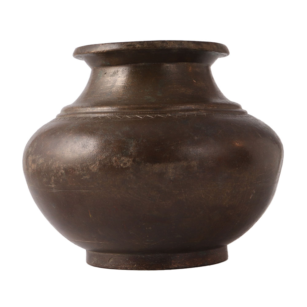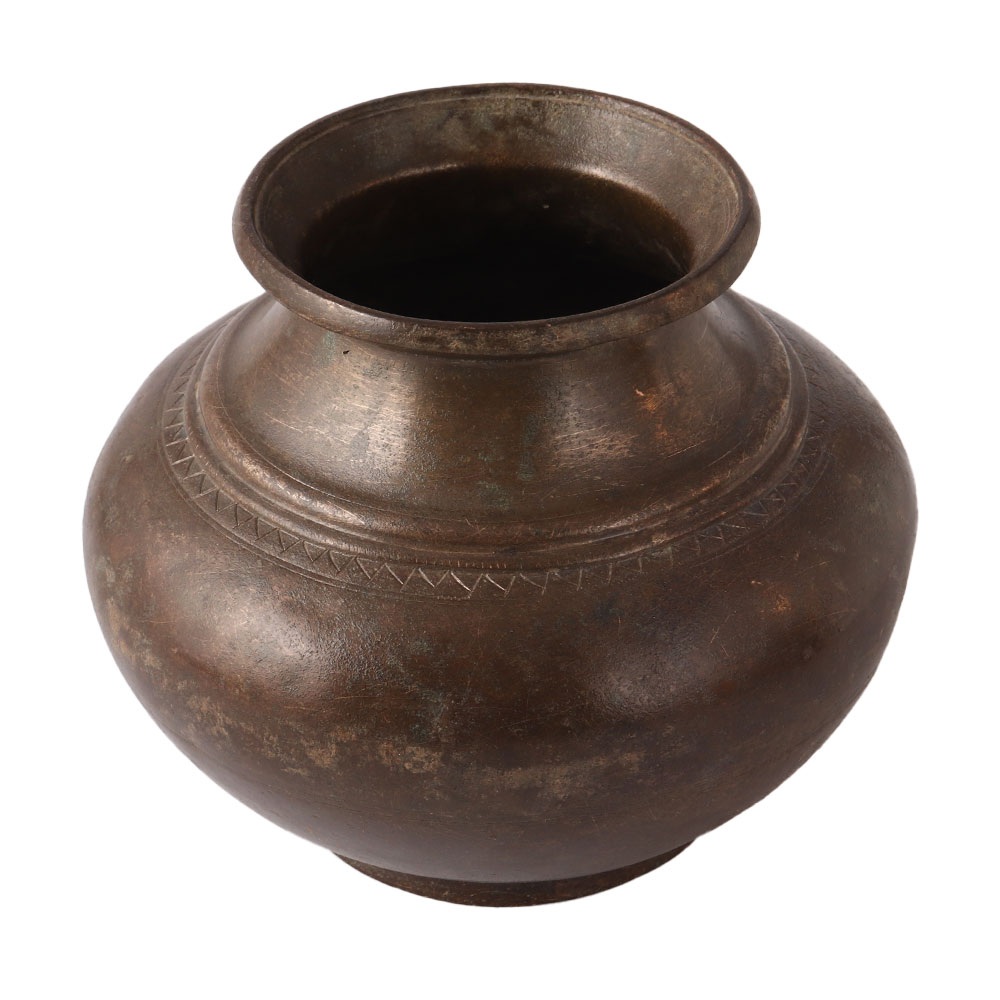 This old brass water pitcher or pot has a vintage design. It has embossed lines in addition to engraving. Its design makes it heavy and appear muscular. It can be used as a flower pot in homes, hotels, and restaurants and has an antique finish. a suitable present for a religious occasion.