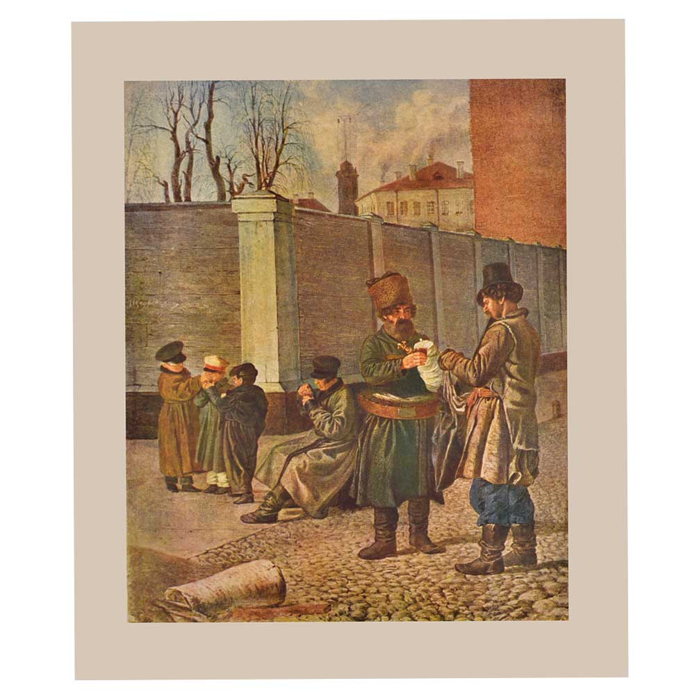 The Poster shows two men exchanging goods with each other oneis a middle aged man with a long beard and the other is a young boy waering a hat and boots . In the background we can see three children playin and another man seated on the pavement of a corner street . An nice home decor product and a gift for friends and relatives.