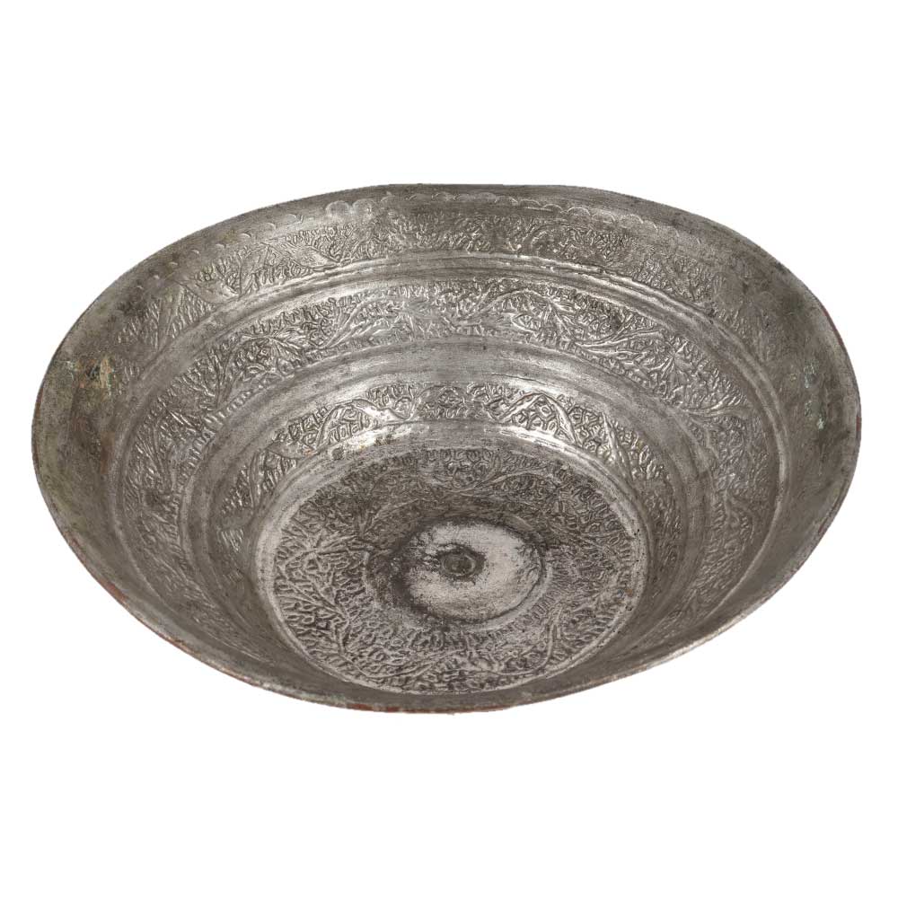 The handmade copper bowl is a one-of-a-kind utensil with a floral band design on the rim or mouth of the bowl. An ideal enhancement to any kitchen or home interiors.  It is made by expert craftsmen using traditional methods.