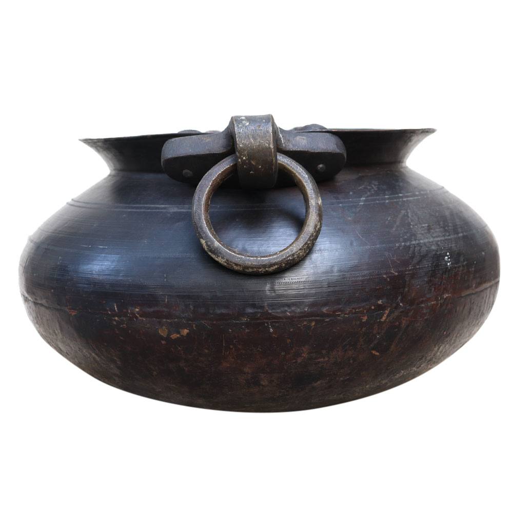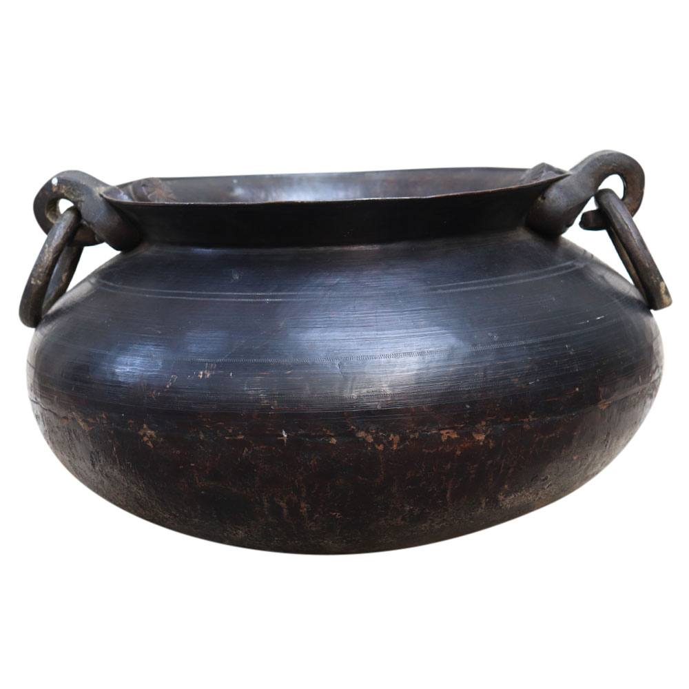 Excellent rustic brass cooking pot with a wide range of potential future uses throughout the house. Rustic brass  pot with circular handles manufactured by hand and fastened. This might be used as a planter or as a log bin. Bottom has a slight rounding.