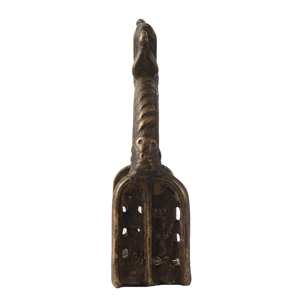 These custom-crafted brass horse stirrups are made in India by regional artisans. It is ideal for equestrian or cottage chic decor because of its excellent vintage condition. a lovely complement to your farm-themed furniture. a single, vintage stirrup that is incredibly heavy and has an oval tread. The curved arch has several carvings. can be used to make an ikebana flower arrangement or display little objects.