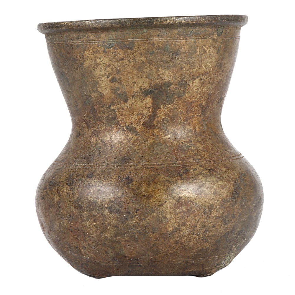 Old brass water storage utensils or antique art ware brass water pot from south India in an unusual shape . This pot served as both a water pot and a kitchen utensil. It can now be used as a planter, garden pot, or ornamental pot. It comes with a patina finish.