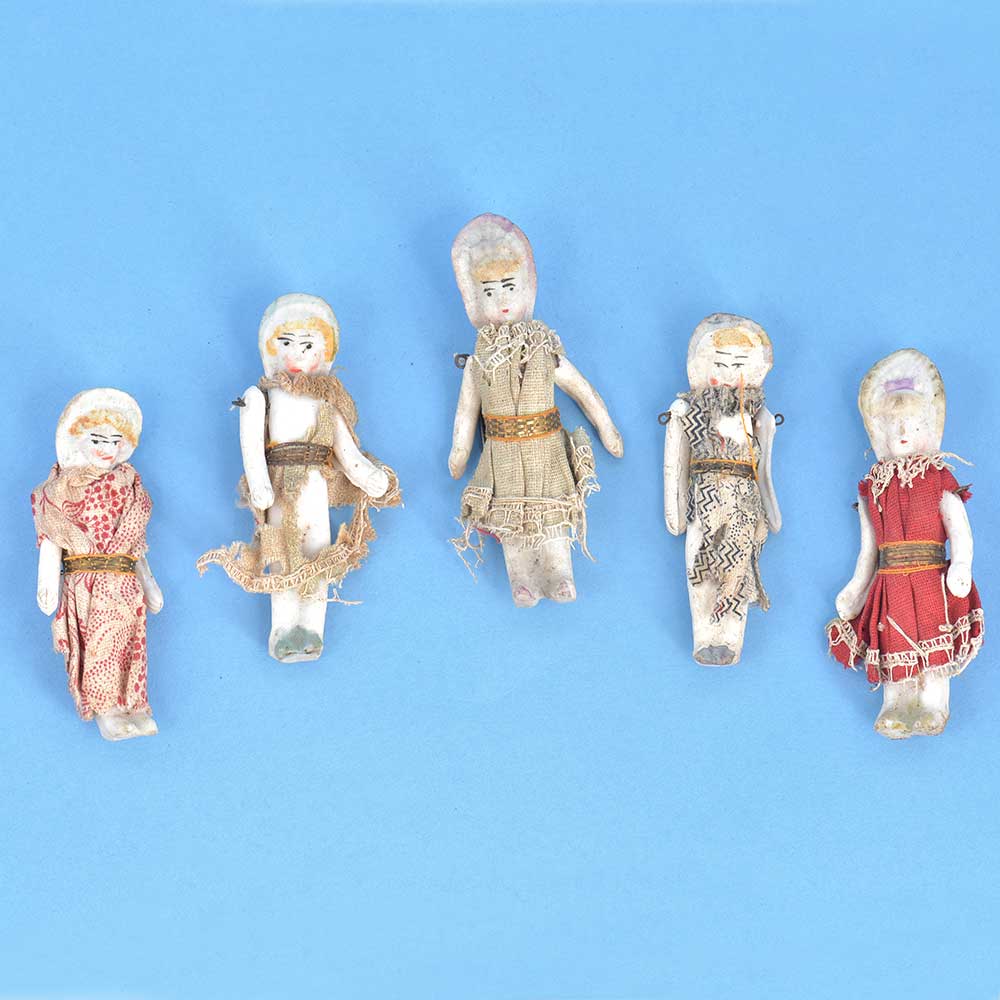 The dolls are very old and are made in porcelain it is available in a set of 5 with a country look in terms of hair style and the kind of clothes that have been worn by them. A veery rare and beautiful collection to be displayed at home or gifted to your near and dea ones.