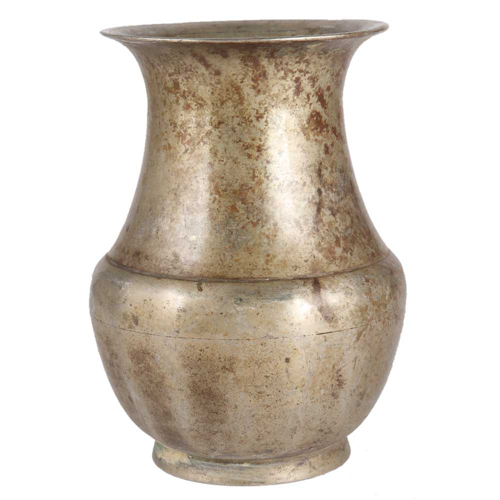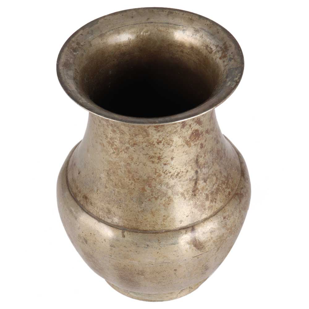A majestic and thick old hindu holy water vessel or pot made of sturdy brass metal that has been beautifully patinated. The graceful style, simple lines, and beautiful casting of this religious item elevate it. This is a great piece that will add point of interest to any space.