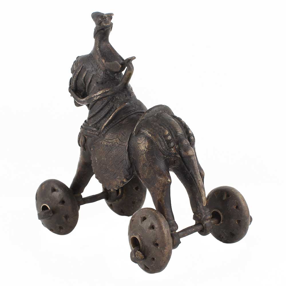 A historic figure of a horse on wheels with a bird statue perched on its head. The horse is decked up with trappings and a decorative saddle cloth that is held in place by ropes. It has a patina finish.