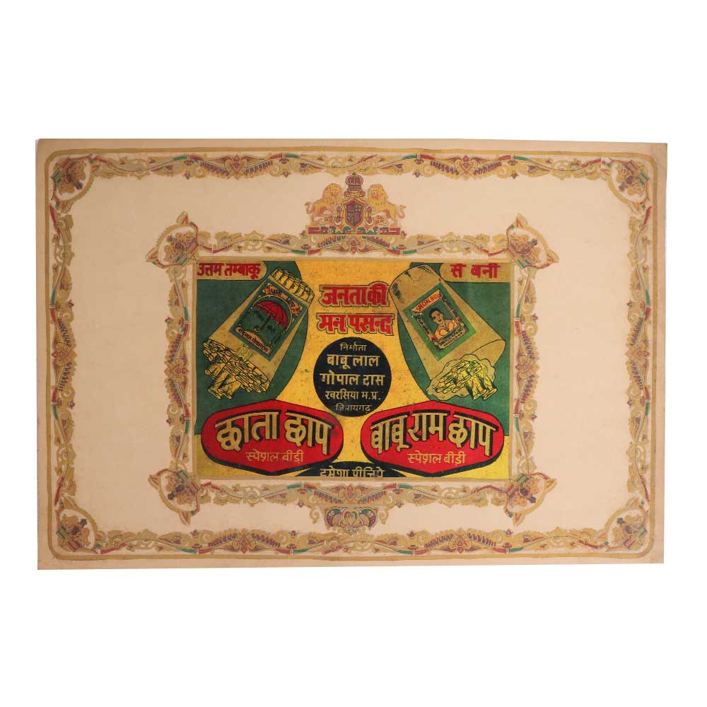 Own a piece of nostalgia with this vintage oleograph paper print of a Bidi advertisement. This unique print brings you back to the old days of Indian cigarette advertising with its retro graphics and branding. At the center is a mustached man with a mischievous smile enjoying a Bidi cigarette known for its hand-rolled tendu leaf wrap filled with tobacco flakes. This oleograph print lets you decorate your home, office, or man cave with a cool retro Indian advertisement. With its playful graphics and iconic cigarette branding, it's perfect for someone who wants to showcase vintage Indian pop culture. The durable art paper ensures the colors stay vibrant for years to come. Give your walls a nostalgic makeover and bring back memories of the good old days in India with this unique Bidi cigarette ad print. It makes a thoughtful gift for a history buff or someone who remembers when Bidi cigarettes were all the rage.