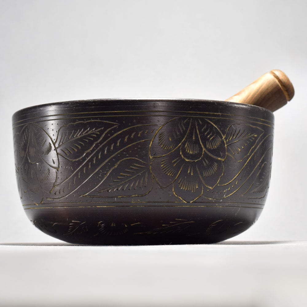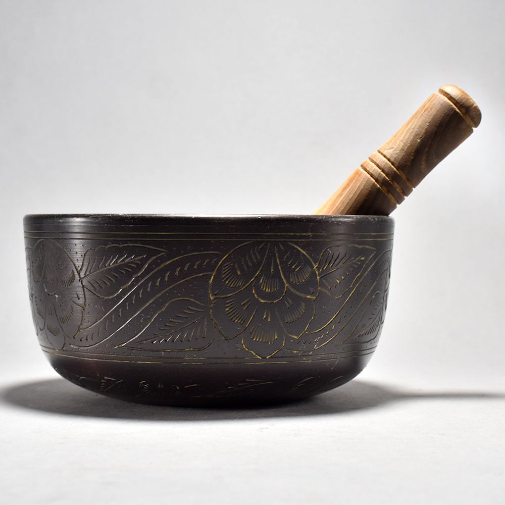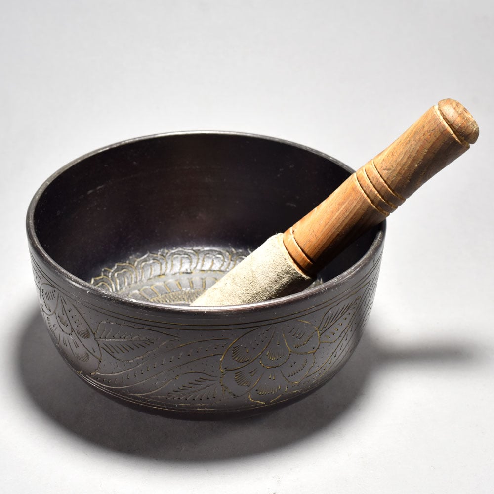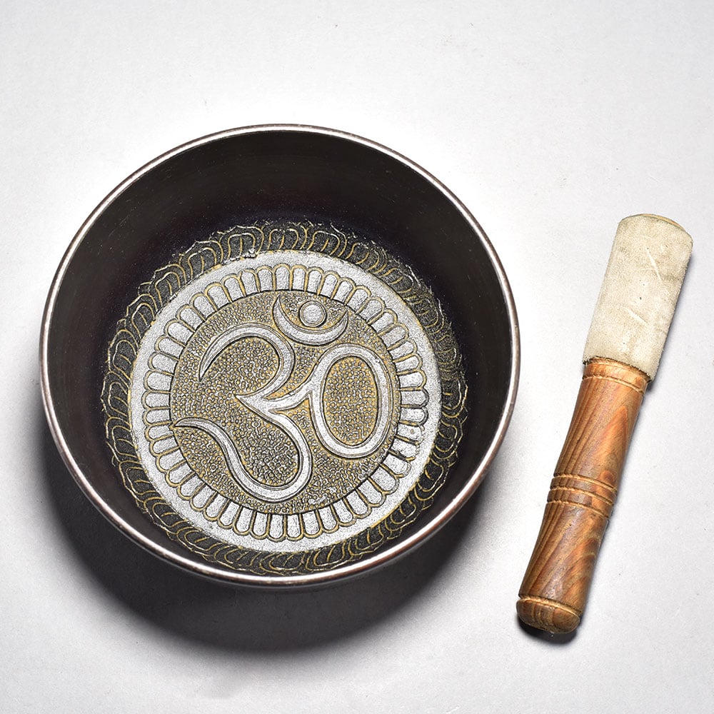 Discover the ancient power of Tibetan meditation with this Om Carved Singing Bowl. Crafted with meticulous detail, this stunning metal bowl features intricate Tibetan floral carvings and mantras that create a soothing, calming vibration perfect for relaxation, sound therapy, and deepening your meditation practice.Unlock the restorative benefits of Tibetan sound healing with this beautifully carved singing bowl. Its mesmerizing vibrations will transport you to a state of deep tranquility, allowing you to quiet your mind, relieve stress, and connect with your inner peace. Whether you're an experienced meditator or simply seeking a calming, therapeutic addition to your home, this Om Carved Singing Bowl is a must-have. Bring the ancient wisdom of Tibet into your daily life and elevate your well-being with this sacred sound tool. Hand-painted designs and Tibetan mantras Made of durable metal Used for meditation, relaxation, and sound therapy Includes a wooden striker for playing the bowl