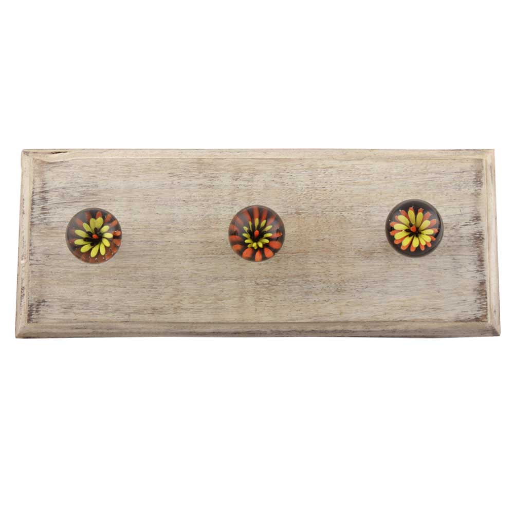 Orange And Yellow Inside Flower Glass Wooden Hook. A Perfect Complement to the Soft Tone of the Wood are these White Traditional Hat and Coat Hook Made of Genuine Porcelain and Brass. It can be used to Hang Jewelry, Leashes, Towels, Scarves, Light Weight Sweaters, Caps etc.