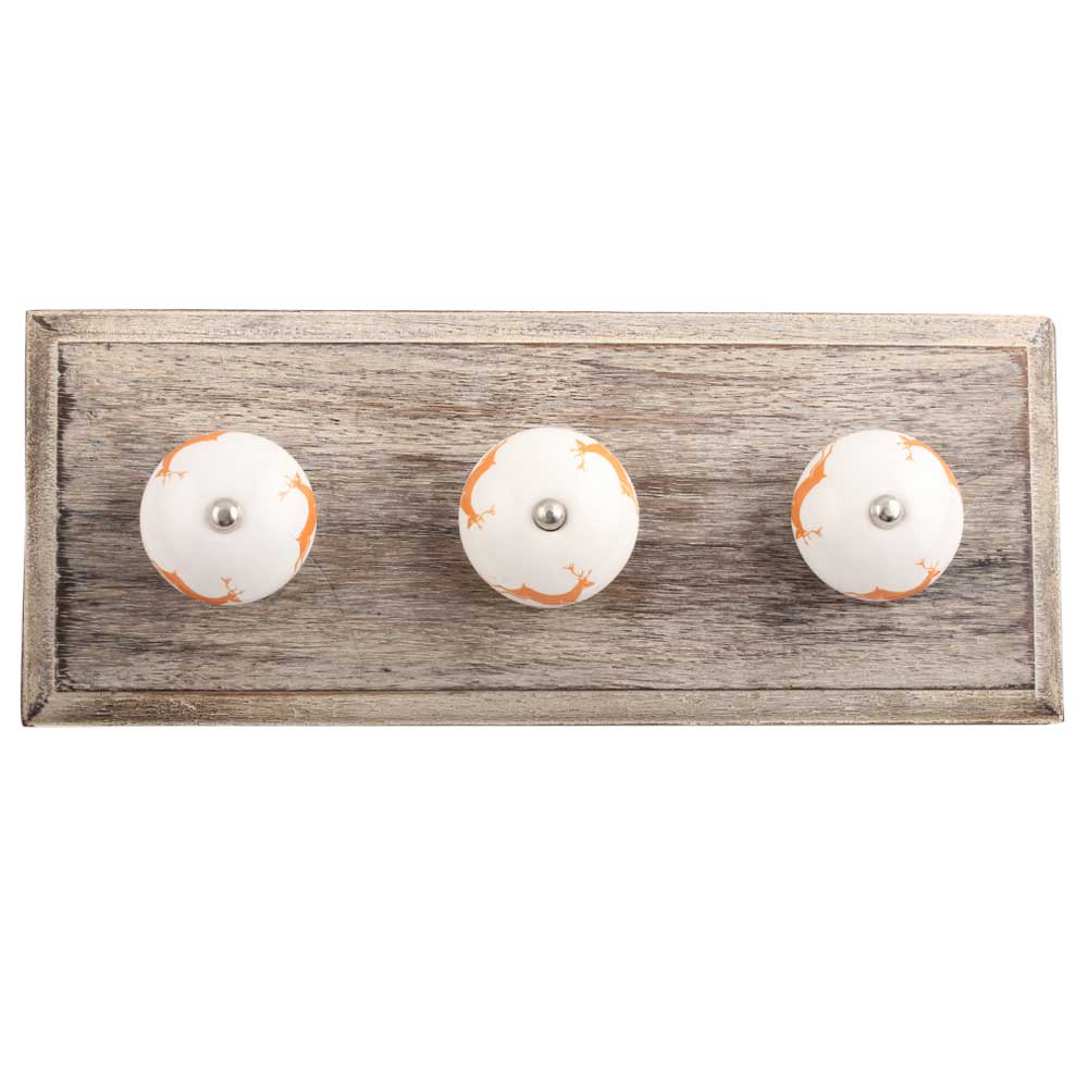 Orange Running Rein Deer Pattern Ceramic Wooden Hook. A Perfect Complement to the Soft Tone of the Wood are these White Traditional Hat & Coat Hook Made of Genuine Porcelain and Brass. It can be use to Hang Jewellery, Leashes, Towels, Scarves, Light Weight Sweaters, Caps Etc.
