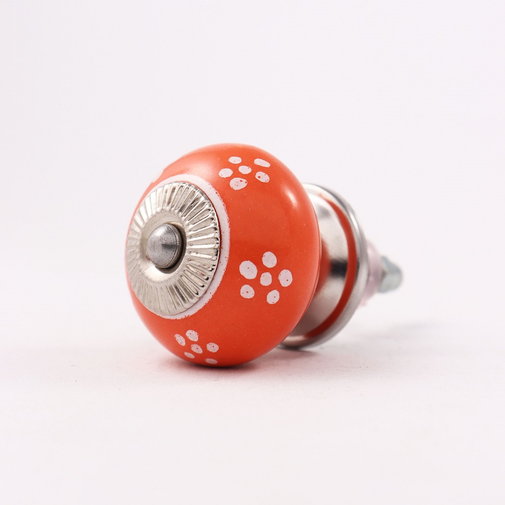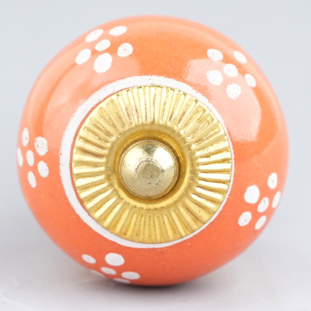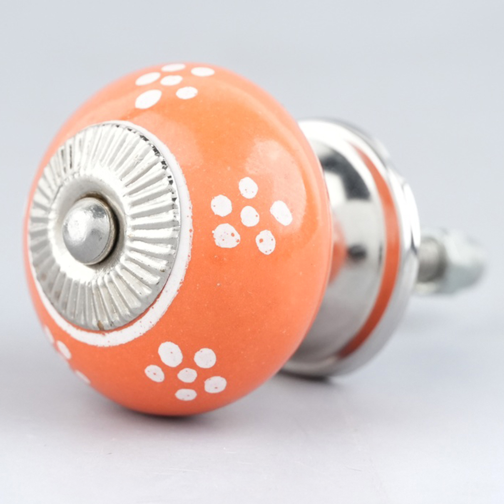 With included standard screw fittings, the Orange Tiny Floral Ceramic Knob is easy to install, allowing you to quickly transform the look of your furniture. Whether you are refreshing your dresser, updating your bathroom, or replacing old hardware, this knob offers a quick and effective way to add a pop of color and personality.