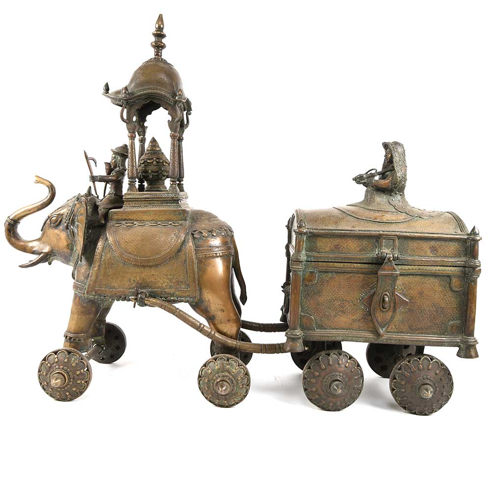 Original Vintage Brass Elephant Cart, Collectible Chariot Home Decor with Bronze Box or Chest
