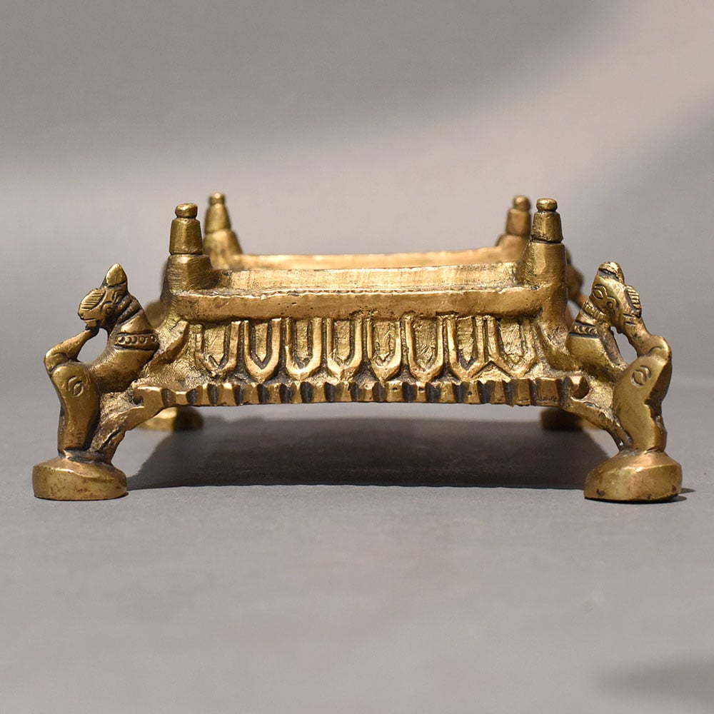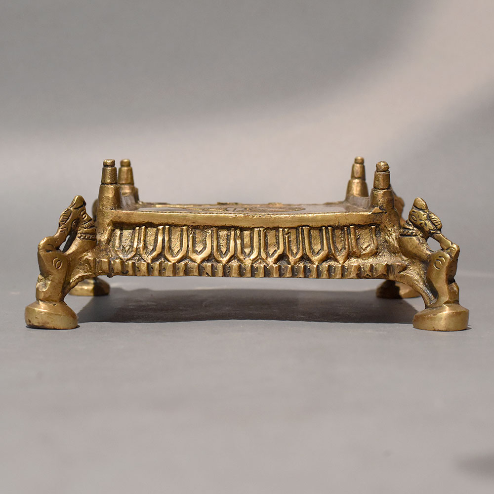 This ornamental brass chowki stand handcrafted in traditional style serves as both a functional platform and a decorative accent rooted in heritage design. Elevated on four sturdy legs, the stand features intricately sculpted side elements resembling stylized animal motifs, adding a symbolic and architectural touch. The rectangular top provides a stable surface, making it suitable for displaying idols, lamps, incense holders, or small ritual items. The front panel is adorned with carved geometric and temple-inspired detailing that enhances its antique aesthetic. The rich brass tone carries subtle variations that highlight its engraved patterns and sculptural contours. Crafted using time-honored casting techniques, the structure reflects careful workmanship and balanced proportions. Traditionally used in pooja rooms and ceremonial settings, a chowki stand elevates sacred objects, symbolizing respect and reverence. This handcrafted brass piece can also function as a decorative riser for collectibles, small planters, or artistic displays in living rooms and heritage-inspired interiors. Its compact yet bold design makes it versatile for both devotional and decorative purposes. The solid brass construction ensures durability and long-term stability, while minor finish variations affirm its artisanal authenticity.