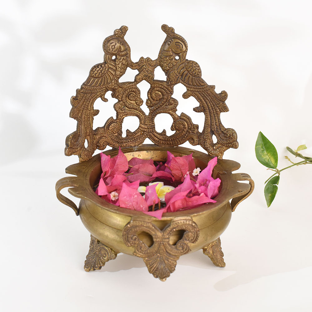 Make a regal statement with this ornate peacock brass urli, a stunning fusion of function and artistry. Set upon elegant legs with a detailed backrest depicting twin peacocks, the bowl is designed to hold water and floating flowers, instantly transforming any corner into a sanctuary. Use it as a showpiece during weddings, festivals, or housewarming ceremonies to evoke a sense of grandeur and devotion. The intricate carvings showcase the talent of artisans, while the solid brass construction ensures durability. Even when empty, the piece stands as a sculptural work of art. Place it in your entryway, pooja room, or living room to infuse your home with a touch of royal Indian tradition.