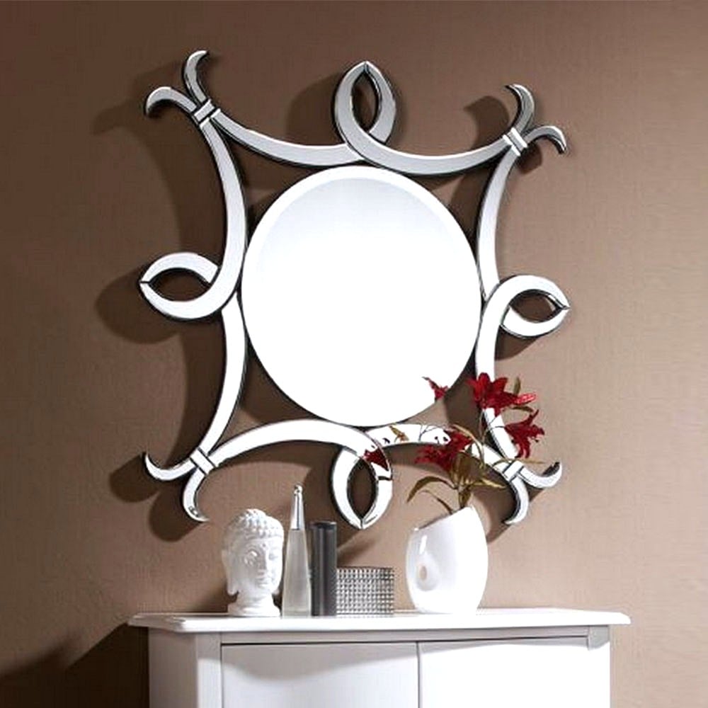 This decorative wall mirror features a round central reflective surface framed by flowing scroll-inspired mirrored elements. The curved extensions radiate outward in a balanced formation, giving the mirror a graceful, ornamental presence that blends classic elegance with a contemporary mirrored finish. Its sculptural form adds character while maintaining visual lightness.