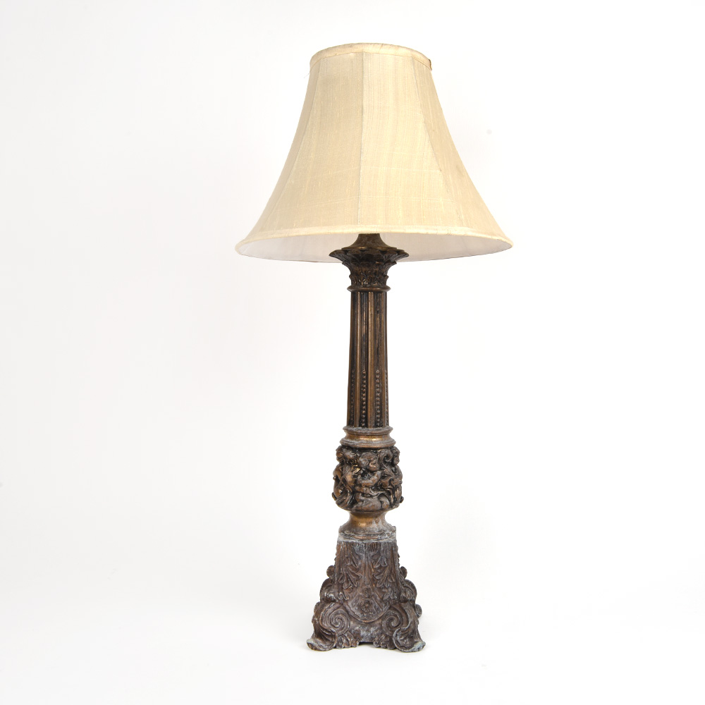 Ornate Victorian metal lamp stand with rose appliqués on the base. The lamp is unique and allows a great lighting option for any room.