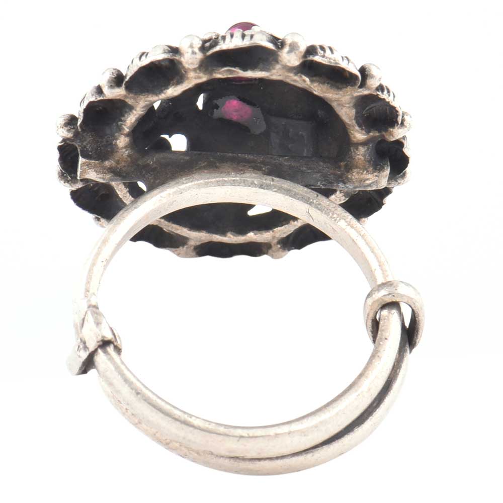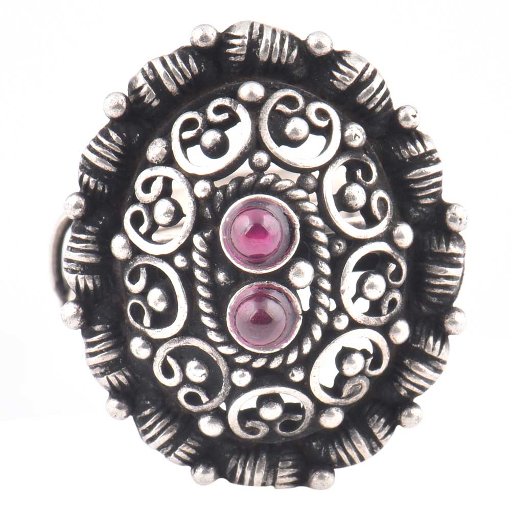 Oval 92.5 Sterling Silver ring with handmade embossed traditional design with two amethyst stone placed one above the other surrounded by embossed motifs and petals design .The ring is adjustable and suitable for wearing it for weddings, engagements, cocktail party, social or religious functions etc .Gift it to your sister, mother, friend, wife or other family friends and relatives.