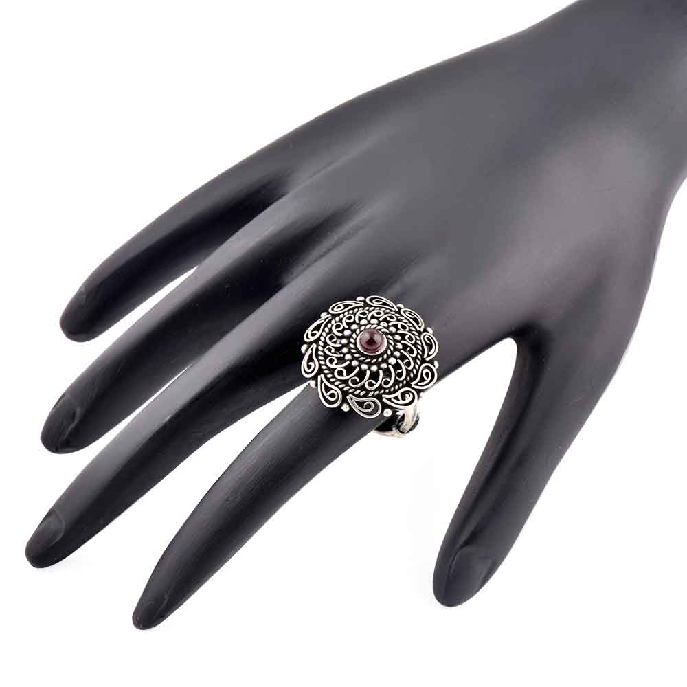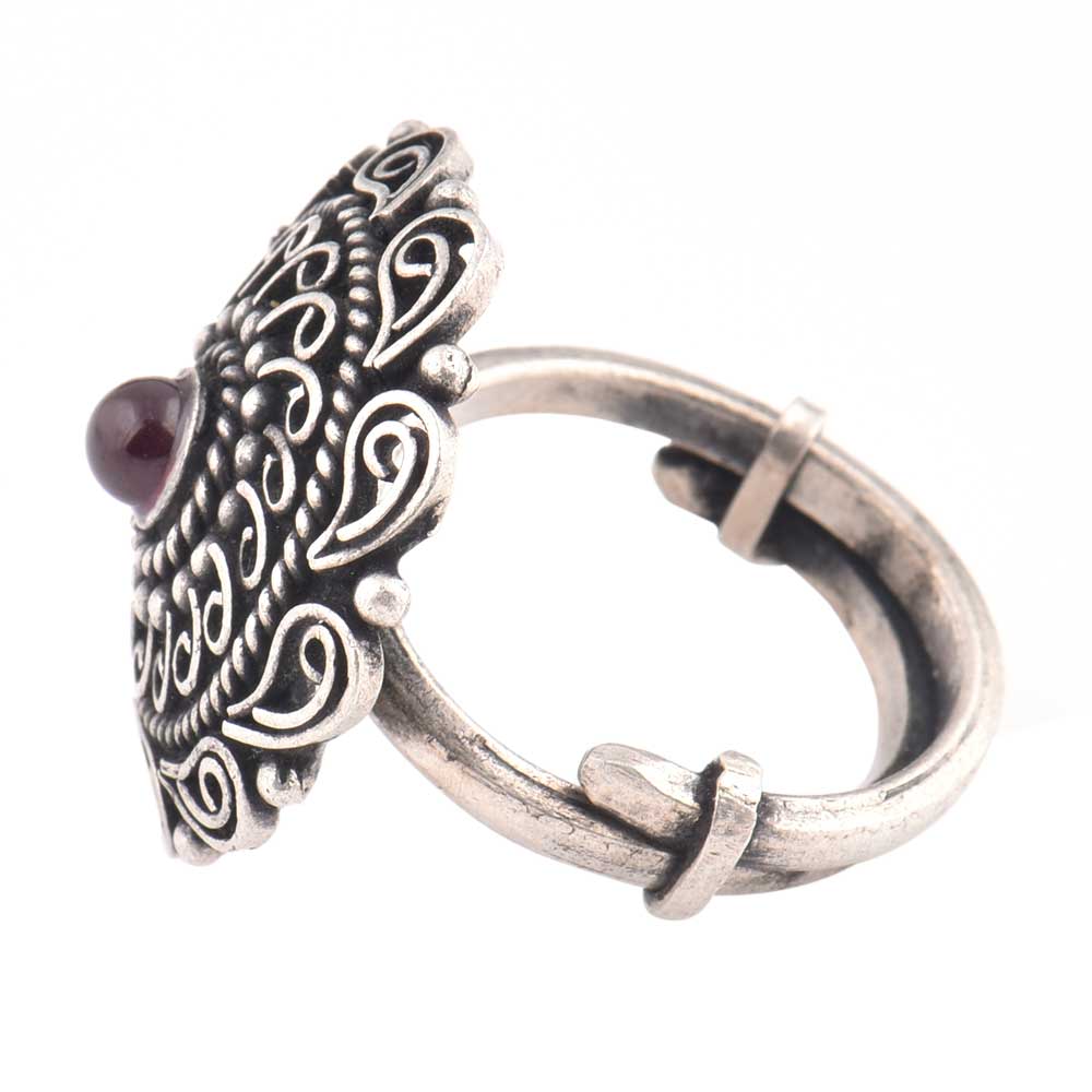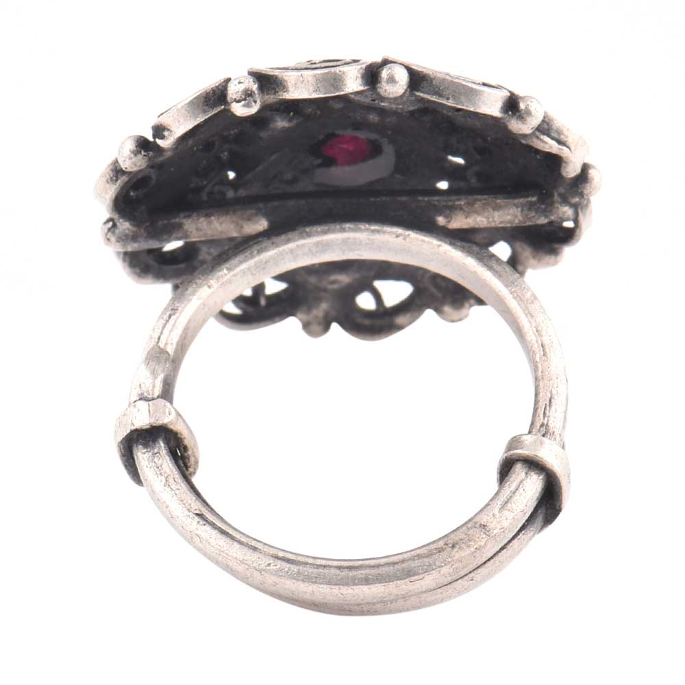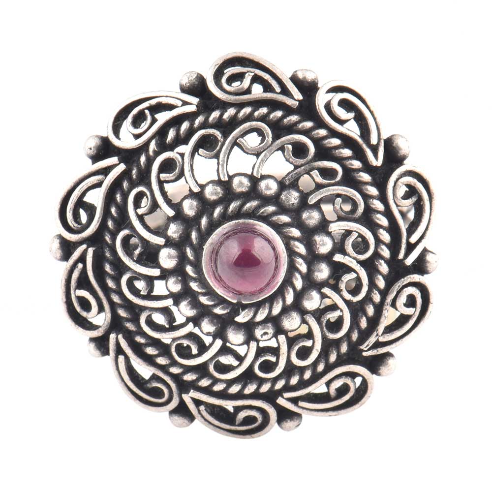 Oxidized 92.5 Sterling silver Ring Adjustable Amethyst Stone Studded Floral and Paisley Design (Free Size)