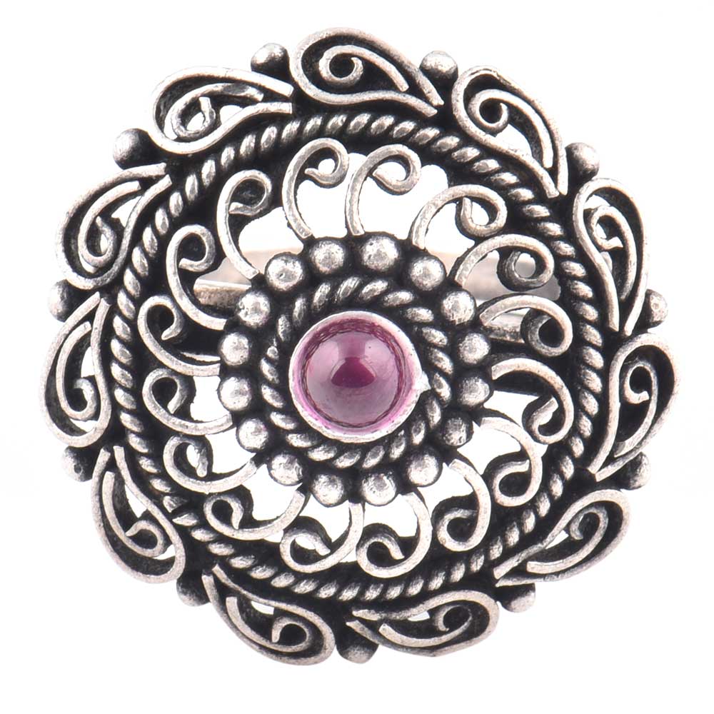 92.5 Sterling silver ring adjustable with elaborate design of floral and paisley design with a small amethyst stone studded in the centre .An exclusive ring for a formal function such as weddings, engagements , bridal shower, parting gift, souvenir or as a token of love . Can be worn by girls, sisters, wives and that someone special.