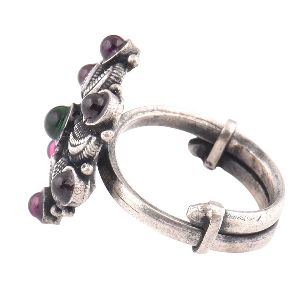 Oxidized 92.5 Sterling Silver Ring Adjustable Flower Decorated With Amethyst and Onyx Stones (Free Size)