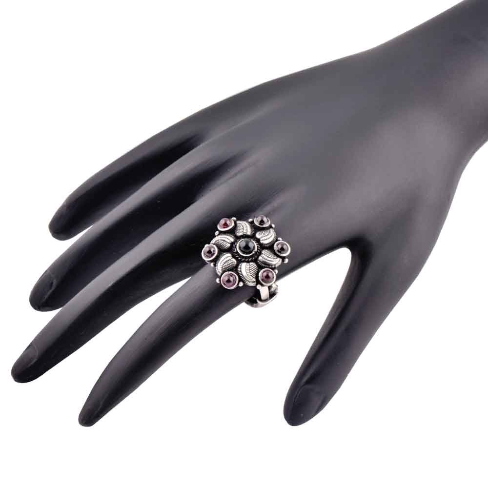 • Oxidized 92.5 Sterling Silver Ring Adjustable Flower Decorated With Amethyst and Onyx Stones (Free Size)