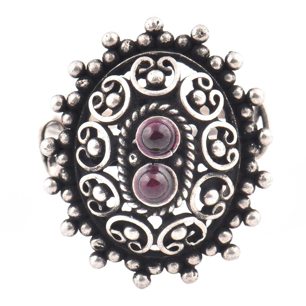 Oxidized 92.5 Sterling Silver Ring Adjustable Oval Engraved Amethyst Studded Ring (Free Size)