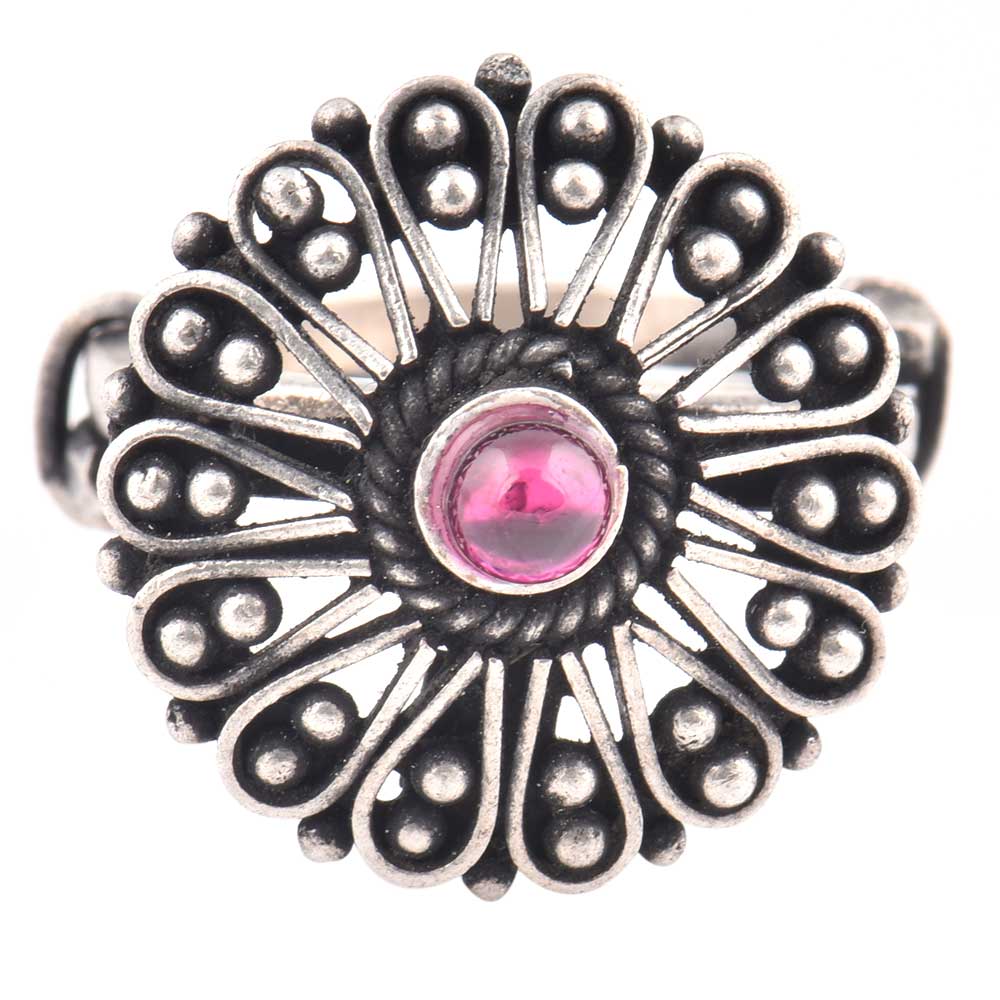 • Oxidized 92.5 Sterling Silver Ring Adjustable Parsley Amethyst Stone Studded Fashion Ring (Free Size)