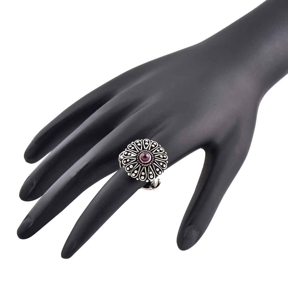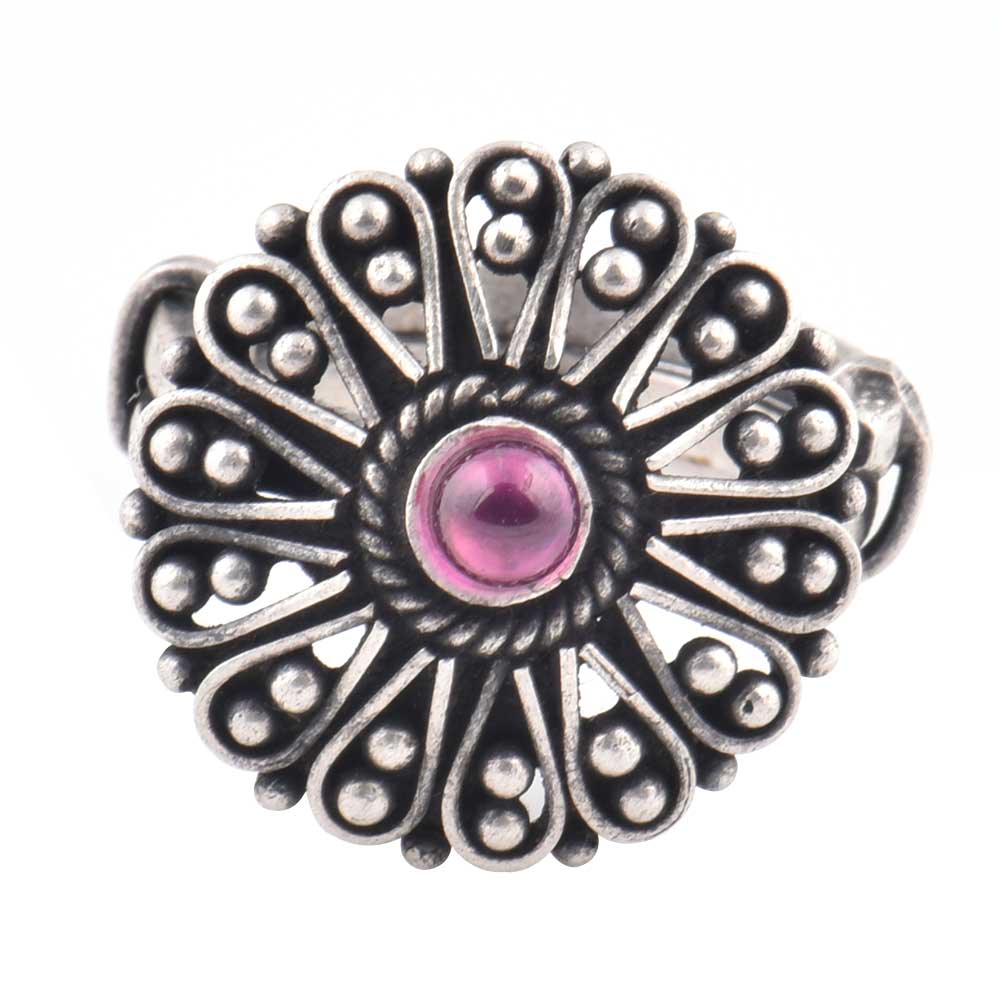Make an impression by wearing this handcrafted Oxidized 92.5 Sterling silver ring that adjusts to the size of your finger. It is further decorated with semi precious Amethyst stone in the centre of floral design with two tiny balls on the edge of the petals. Wear it a wedding, engagement, birthday to complement it with your traditional as well as modern outfit.