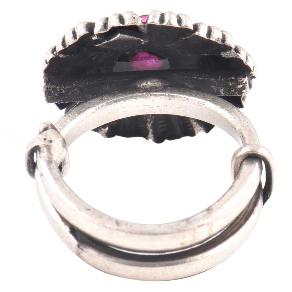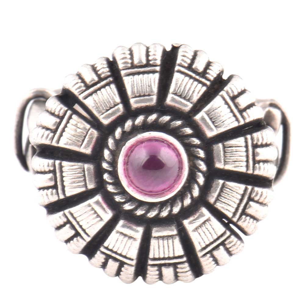 A very rare design of 92.5 sterling silver ring that can be adjusted according to the finger with a unique floral design with petals with a space in between and round Amethyst stone in the centre.