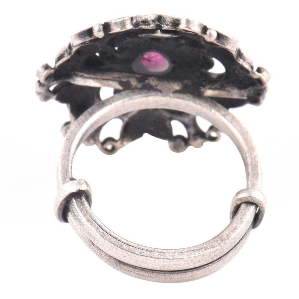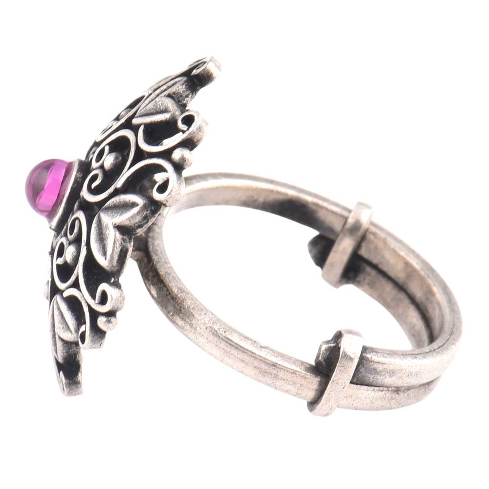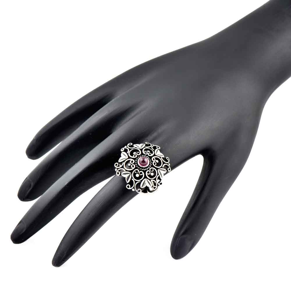 • Oxidized 92.5 Sterling Silver Ring Round Amethyst and Heart Scroll Design (Free Size)