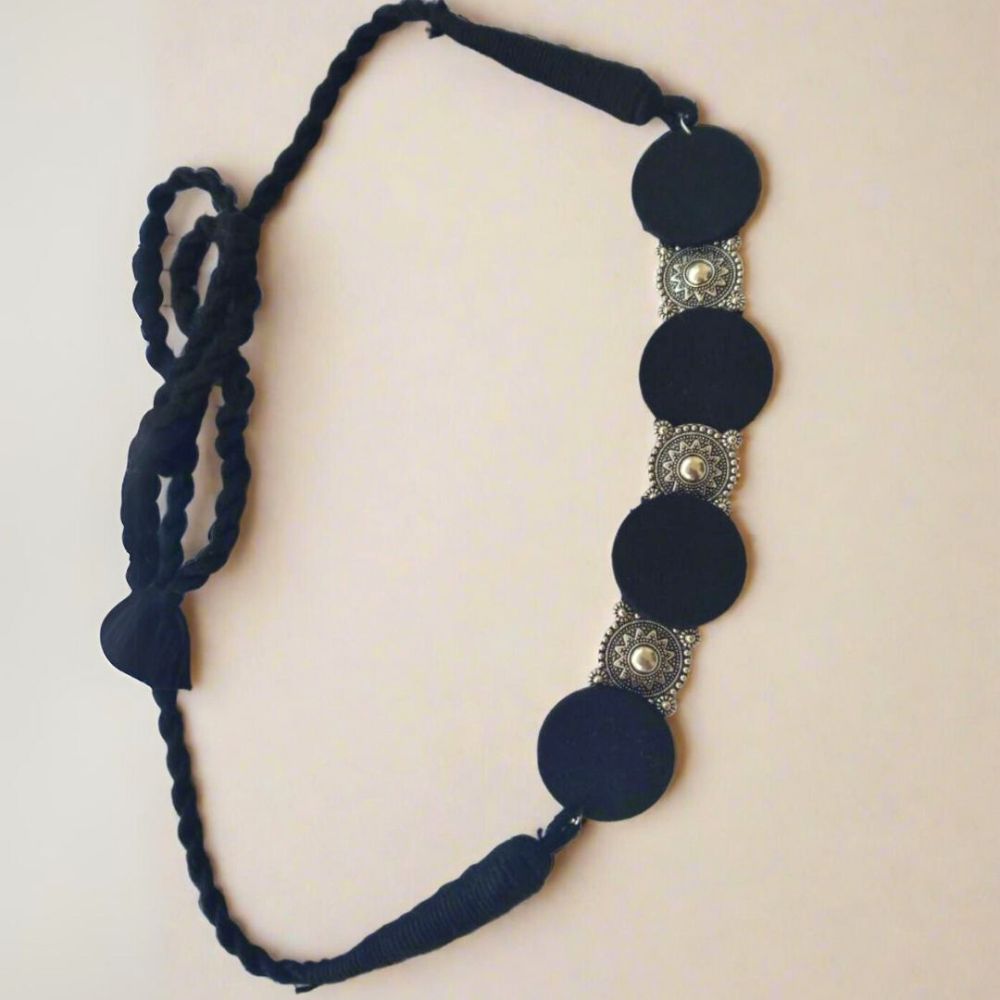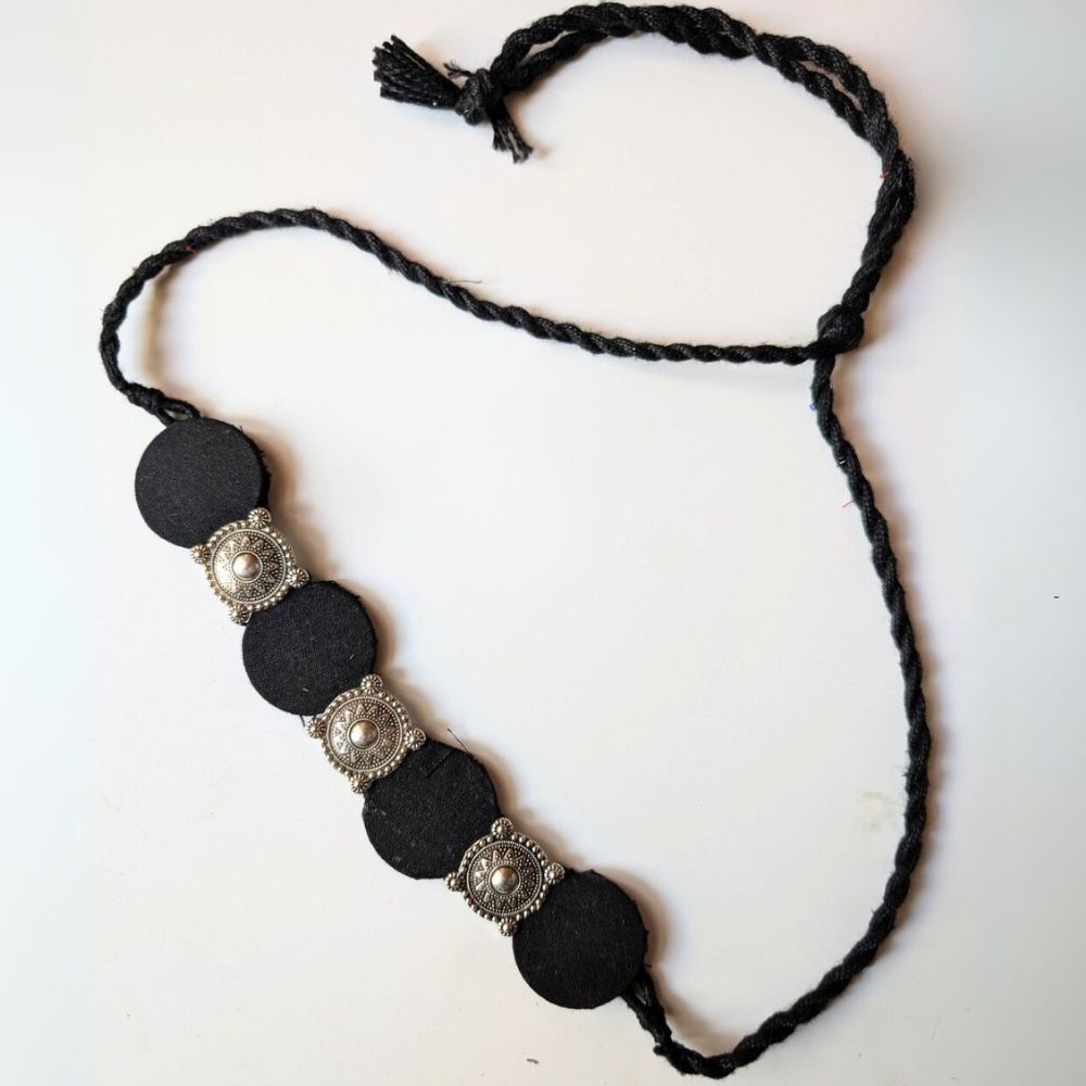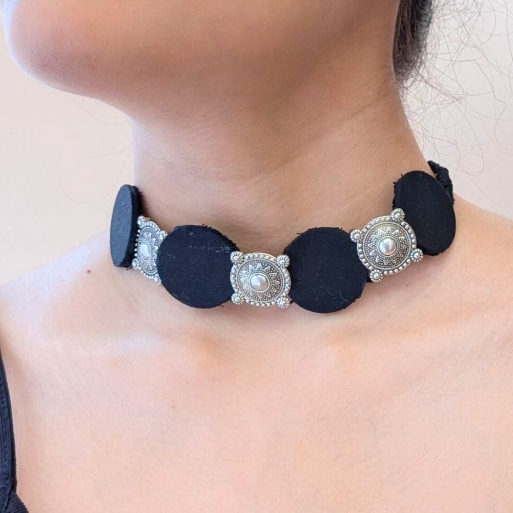 The Oxidized Silver Fabric Choker in Black is a striking blend of modern minimalism and vintage Indian aesthetics. Crafted on a fabric base, the deep black tone creates a dramatic canvas for oxidized silver detailing that carries an old-world charm. Designed to sit comfortably at the neckline, this choker delivers strong visual presence without feeling overpowering. It is an expressive accessory for women who appreciate bold, heritage-inspired jewellery.