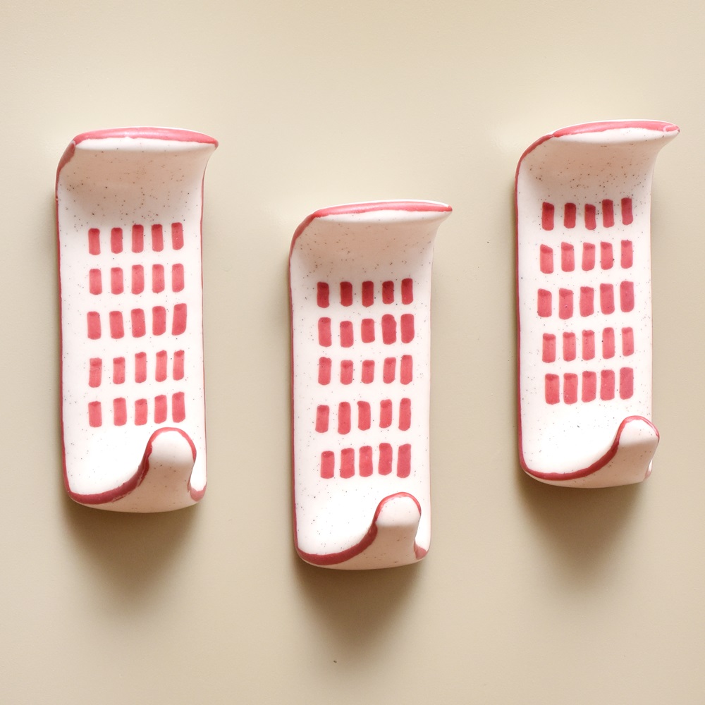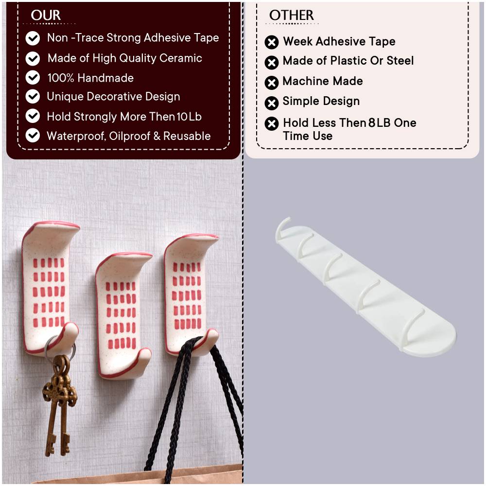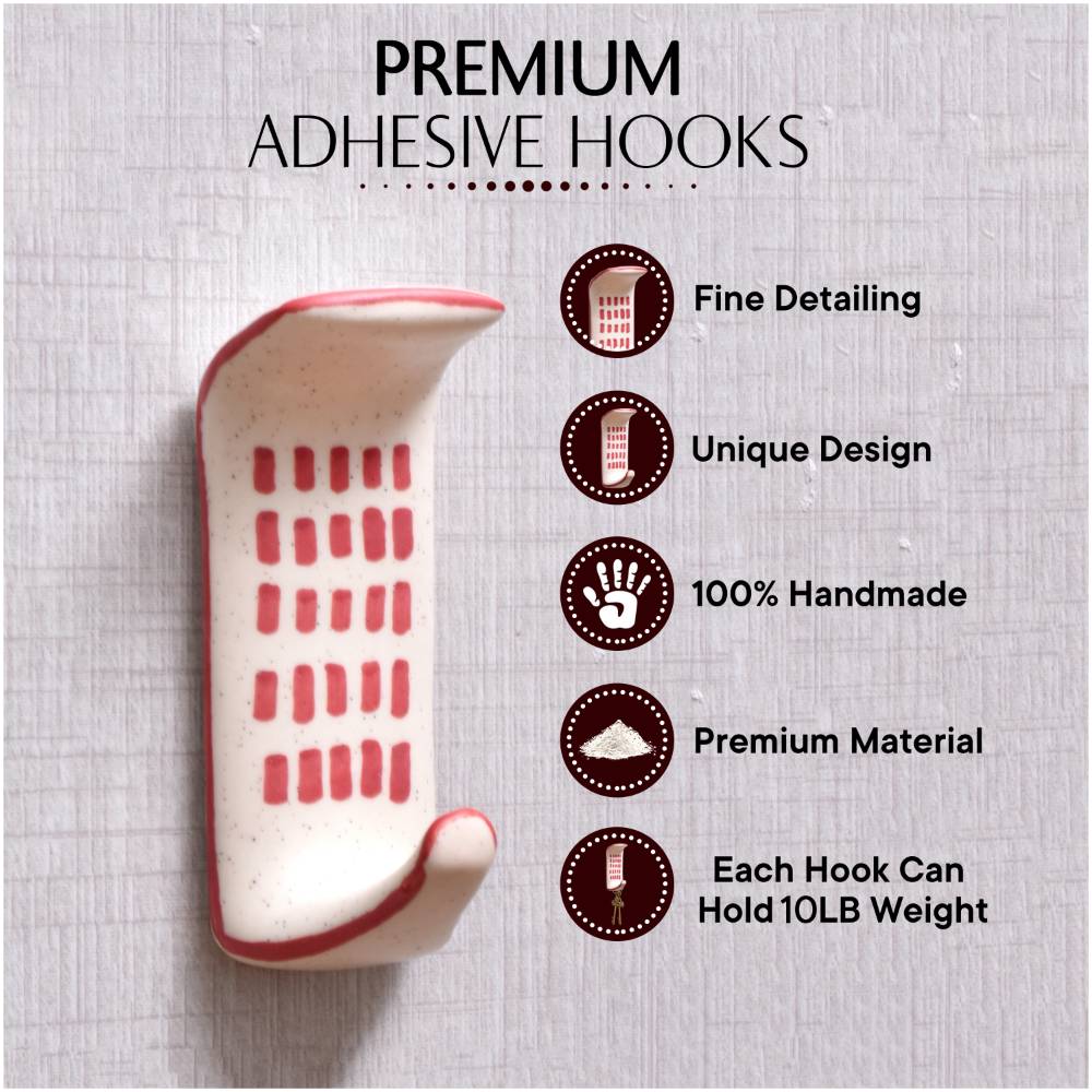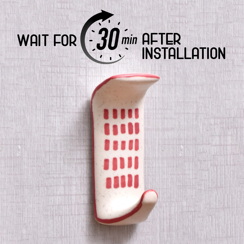 Get a strong, stylish way to display your favorite items with the ceramic adhesive hook. This innovative hook sticks securely to smooth surfaces without any tools or hardware required. Just peel and stick for an instant display solution anywhere. With its modern look and versatile adhesive backing, this ceramic hook is perfect for renters, dorm dwellers, homeowners, and anyone looking for an easy organizing solution. Stick it inside closets, bathrooms, entryways, kitchens, bedrooms, and more to hang items without the hassle of installing hardware. The smooth ceramic and engraved logo add a touch of style while keeping essentials neatly displayed and within reach. Get this simple yet ingenious 3-pack and say goodbye to clutter while creating an organized space you'll love. • Made of durable ceramic material with a sleek white finish and eye-catching engraved design in red • Strong adhesive back lets you attach hooks to most smooth, clean surfaces like tile, glass, wood, plastic, and more • Easily repositionable - just peel off and restick without leaving any residue behind • A pack of 3 hooks provides ample space for coats, hats, towels, artwork, and more