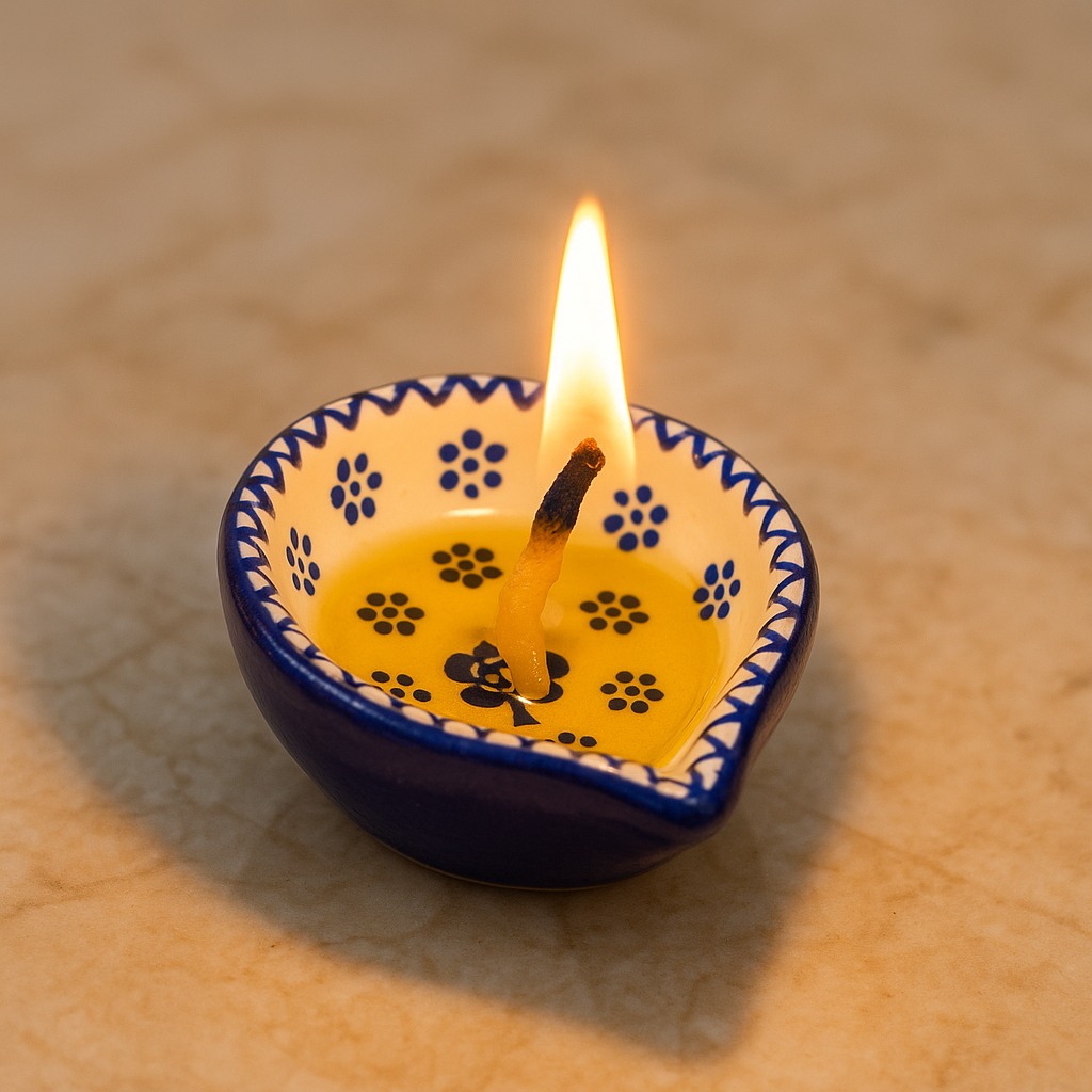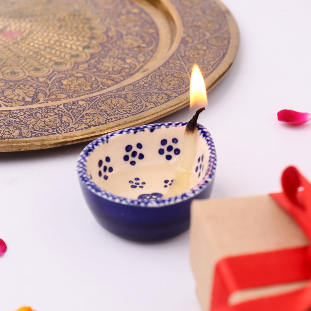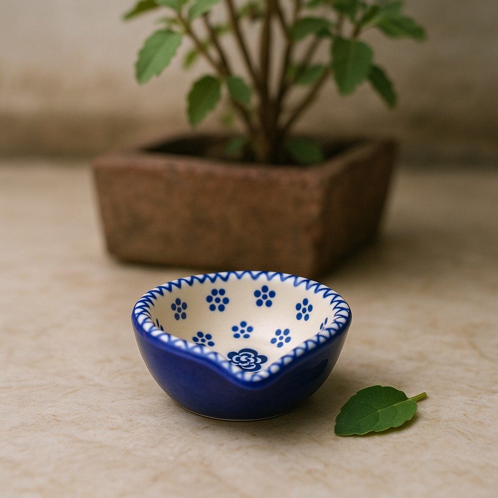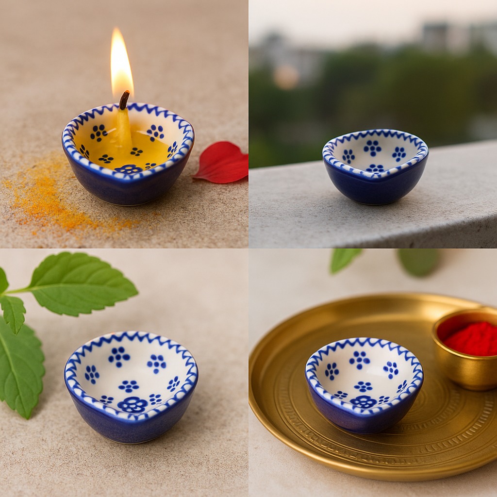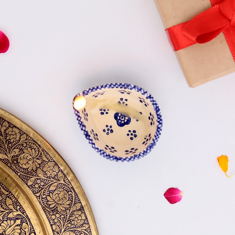 This designer blue and white ceramic Diwali diya is a graceful blend of artistry and spirituality, perfect for temple decoration and festive rituals. Hand-painted with floral motifs in deep indigo on a white ceramic base, it reflects timeless Indian craftsmanship. The diya’s smooth ceramic finish ensures durability, while its vibrant design adds elegance to both traditional puja settings and modern interiors. Compact yet striking, this diya symbolizes purity and devotion while enhancing the aesthetic charm of your sacred space.