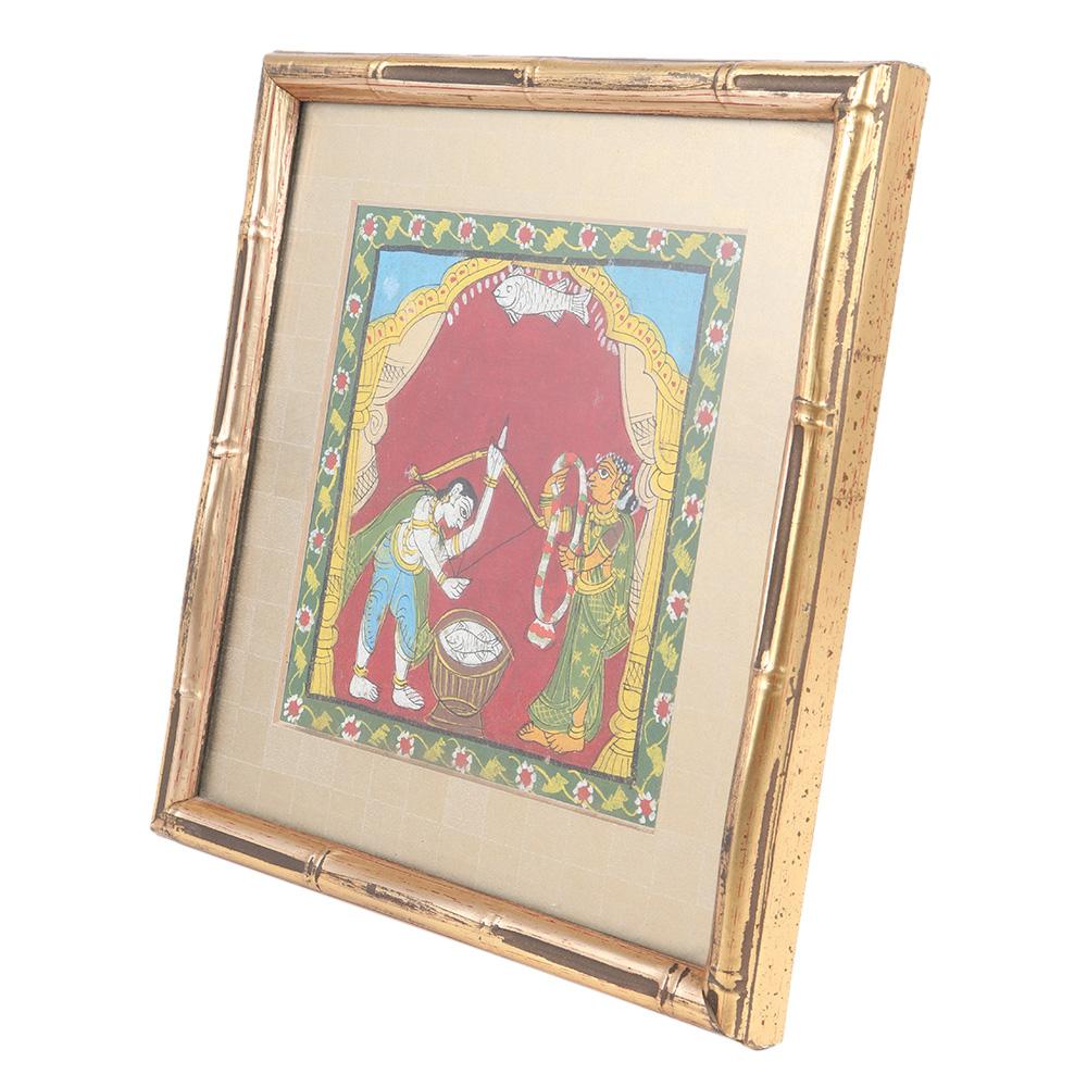 In this Painting, Arjun Mahabharat's marriage in a golden frame brings alive one of the most incredible scenes of the ancient epic. With the blessings of Lord Vishnu, Arjuna managed to break the bow and win over Draupadi. The display of this Madhubani craft attracts positive vibrations around the house. Therefore your life becomes radiant with divinity by displaying or gifting this awesome Painting of Arjun Mahabharat marriage in a golden frame. Opt to display this in your living room area and watch your guests praising its incredible beauty and vintage appeal.