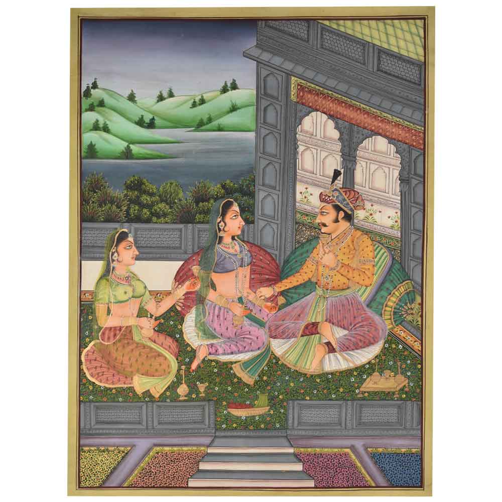 It is a rare and unique miniature picture of the Mughal King's Harem in which the queen is serving the king a drink and he is in the mood for romance. The Harem was a residence for the emperor's female relations and other women. The artist has brought a feeling of seamless rhythm to the figures' faces and stances. The Mughals were great patrons of the arts, using them to support their political positions and leaving a particularly rich legacy of contemporary art behind.