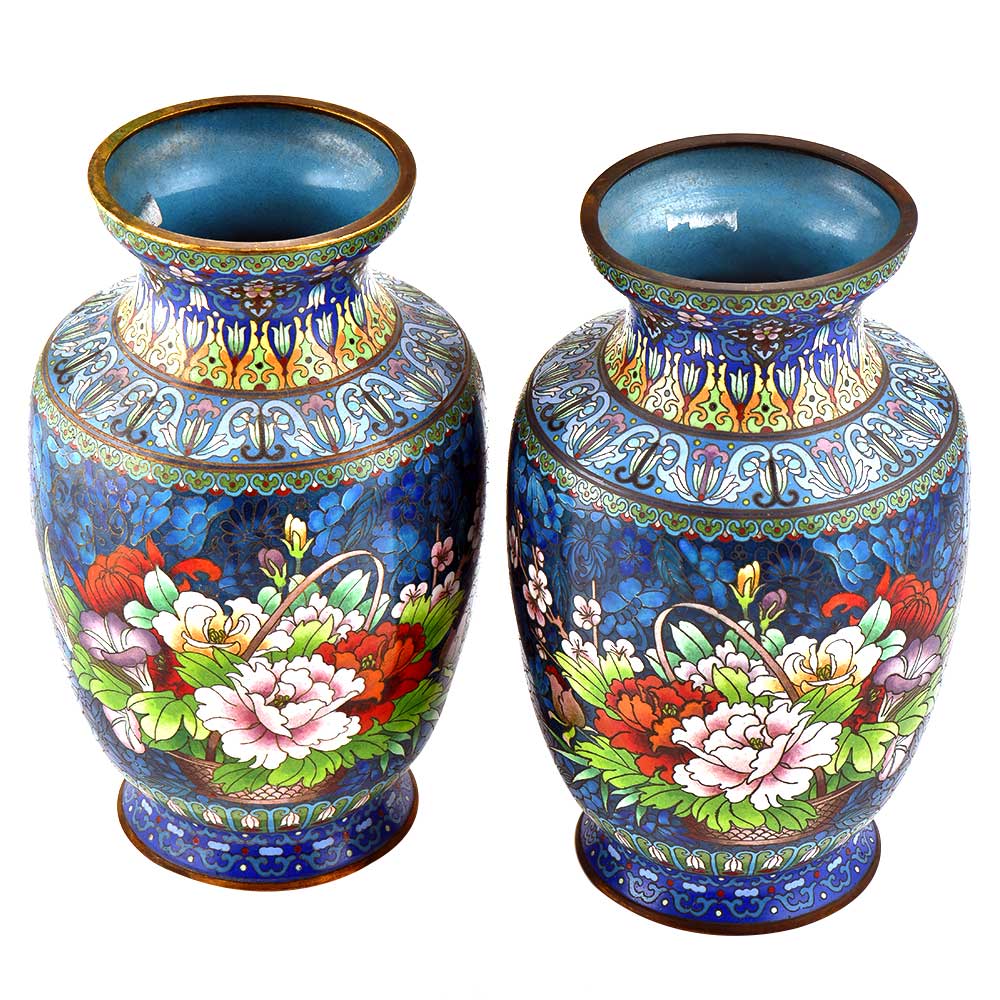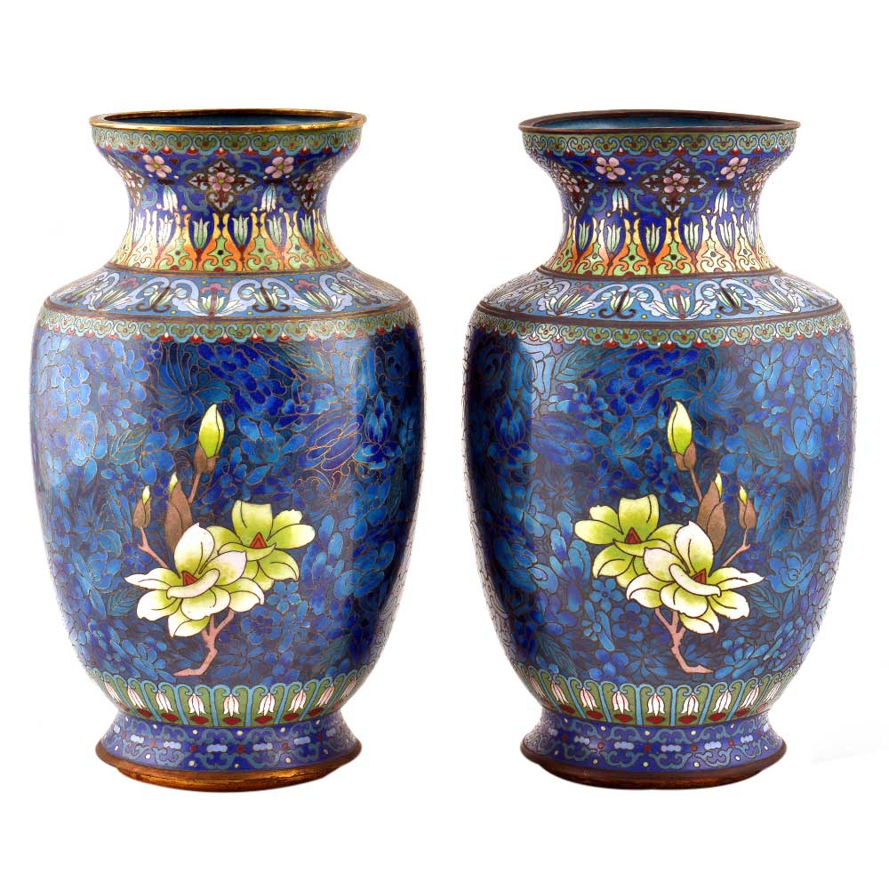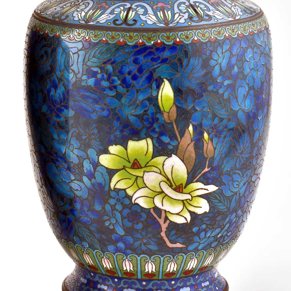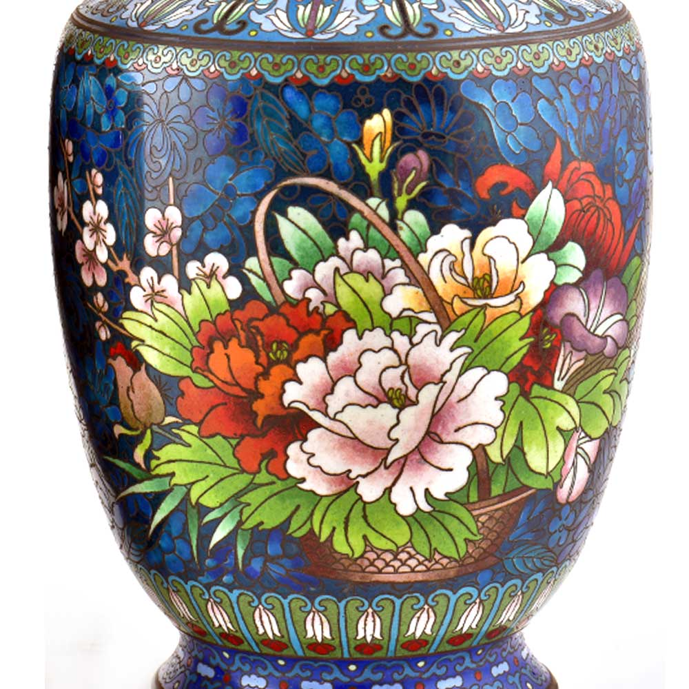 Decorative enameled metal ware called cloisonné exhibit almost superhuman skill by master craftsmen displayed by the marvelous diversity, intricacy and beauty of their designs. Earliest decorative motifs include cloud patterns, lotus flowers, the symbol of purity and beauty later motifs included dragons amid clouds, floral landscapes, scenes from court and mystical animals. Exquisitely detailed petals and leaves with fine color gradations. Fine inlaid wirework at neck and base, which are edged in brass. Exquisitely detailed petals and leaves with fine color gradations. Dark cobalt blue ground with white, rust, orange, yellow, and mauve blossoms; foliage in shades of green edged in rust are some of the popular designs of cloisonné.