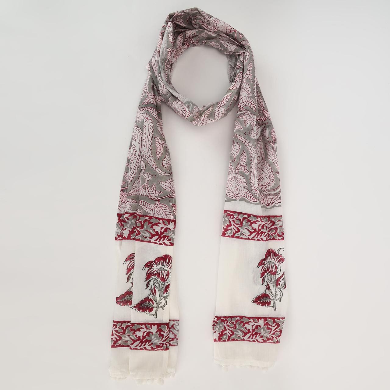 Drape yourself in timeless elegance with this exquisite stole, adorned with intricate paisley patterns and delicate floral accents in rich red, grey, and white hues. Its lightweight fabric and refined design exude sophistication, making it a versatile accessory that seamlessly complements your style.