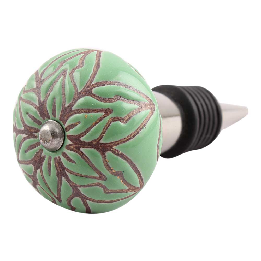 Pea Green Amarylis Etched Ceramic Wine Stopper. zinc alloy wine bottle stopper with attractive Jute Bag Packaging.