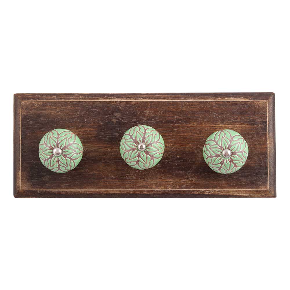 Pea Green Amarylis Etched Ceramic Wooden Hook. A Perfect Complement to the Soft Tone of the Wood are these White Traditional Hat Coat Hook Made of Genuine Porcelain and Brass. It can be use to Hang Jewellery, Leashes, Towels, Scarves, Light Weight Sweaters, Caps Etc.