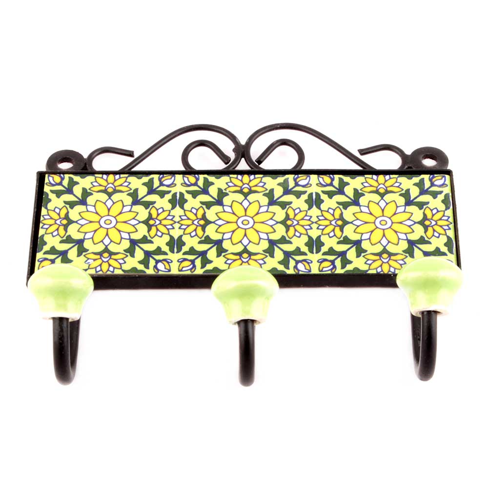 Pea Green And Forest Green Sunflower Tiles Hooks. When Put on Wall or Cabinet it is an Art in itself. The Metal Part of this Hook is Black Powder Coated.