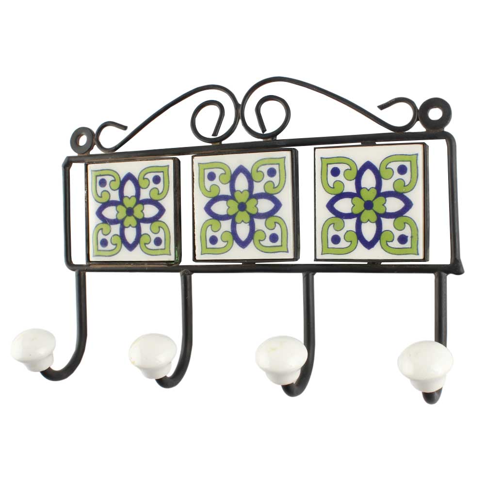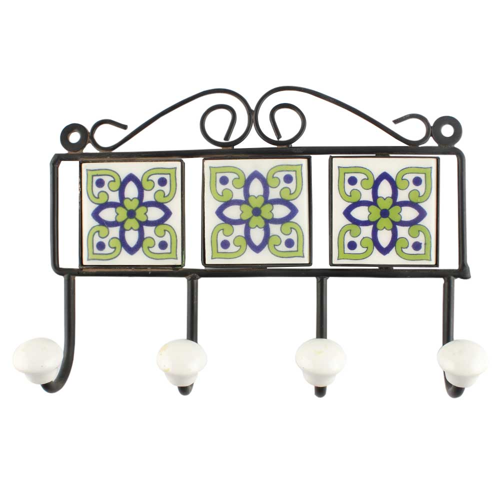 Pea Green Ceramic Floral Tile Wall Hook. When Put on Wall or Cabinet It is An Art in Itself. The Metal Part of this Hook is Black Powder Coated.