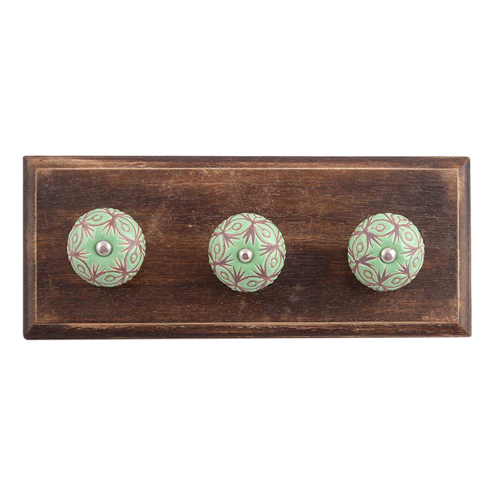 Pea Green Etched Ceramic Wooden Hook. A Perfect Complement to the Soft Tone of the Wood are these White Traditional Hat Coat Hook Made of Genuine Porcelain and Brass. It can be use to Hang Jewellery, Leashes, Towels, Scarves, Light Weight Sweaters, Caps Etc.