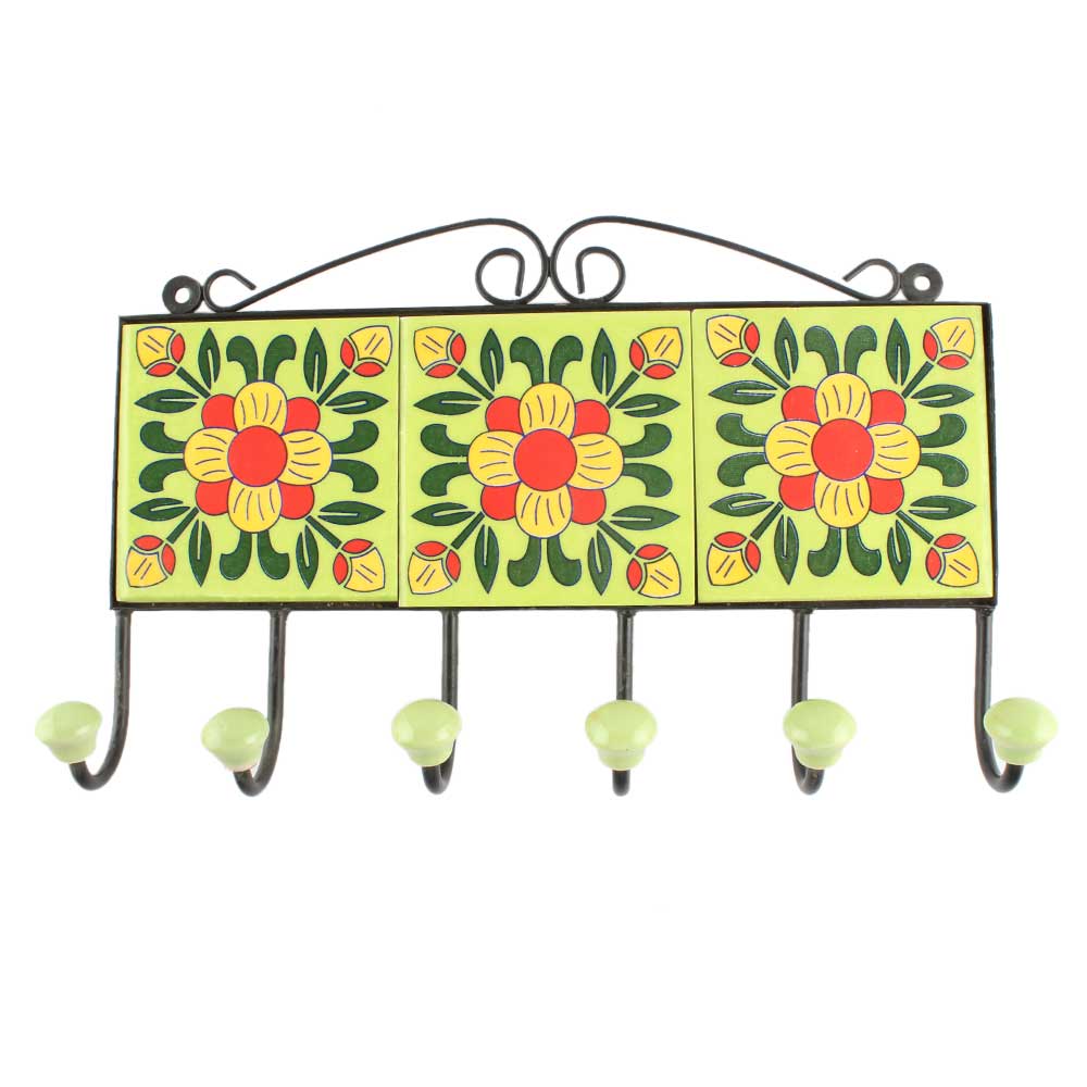 Pea Green Floral Ceramic Tile Hook. When Put on Wall or Cabinet It is An Art in Itself. The Metal Part of this Hook is Black Powder Coated.