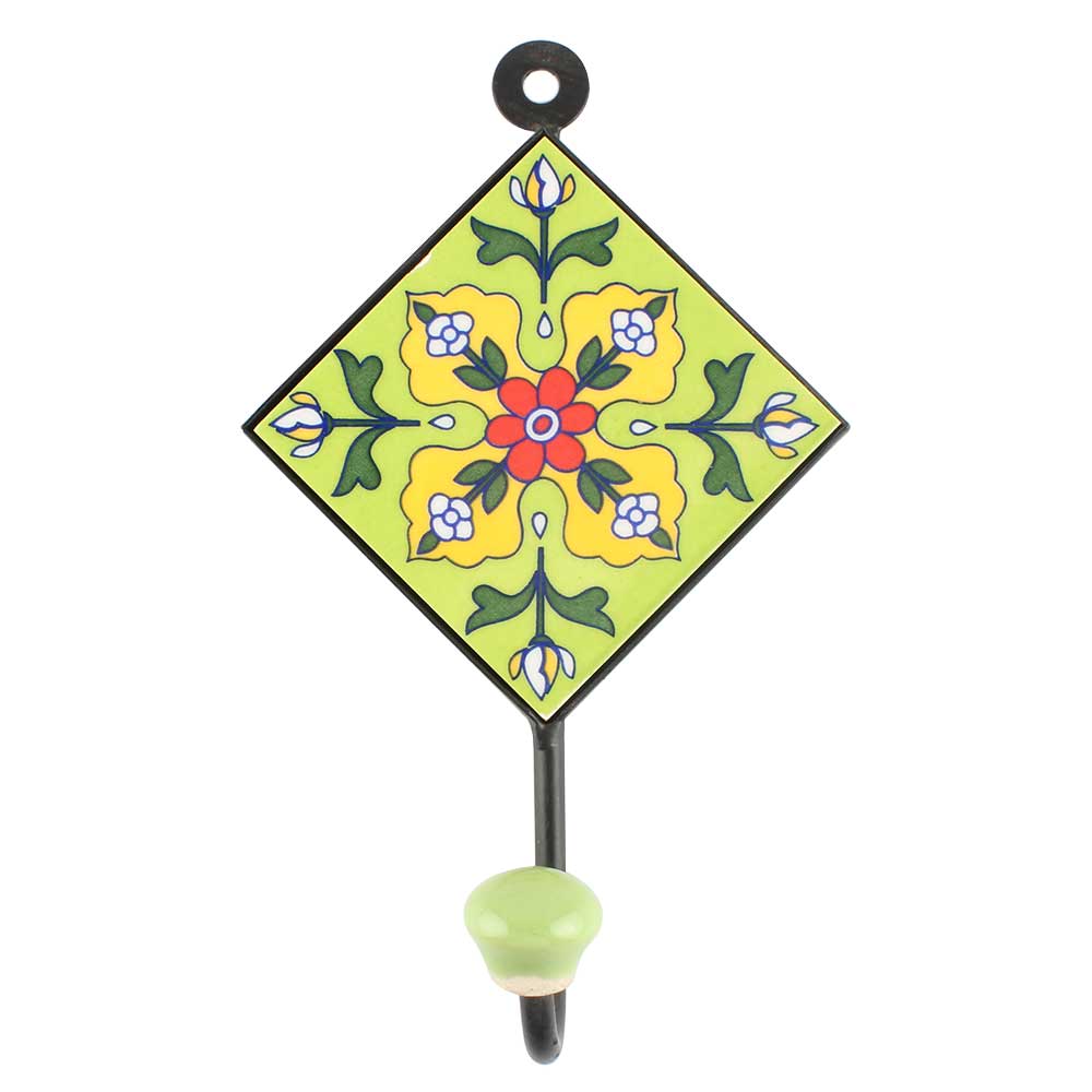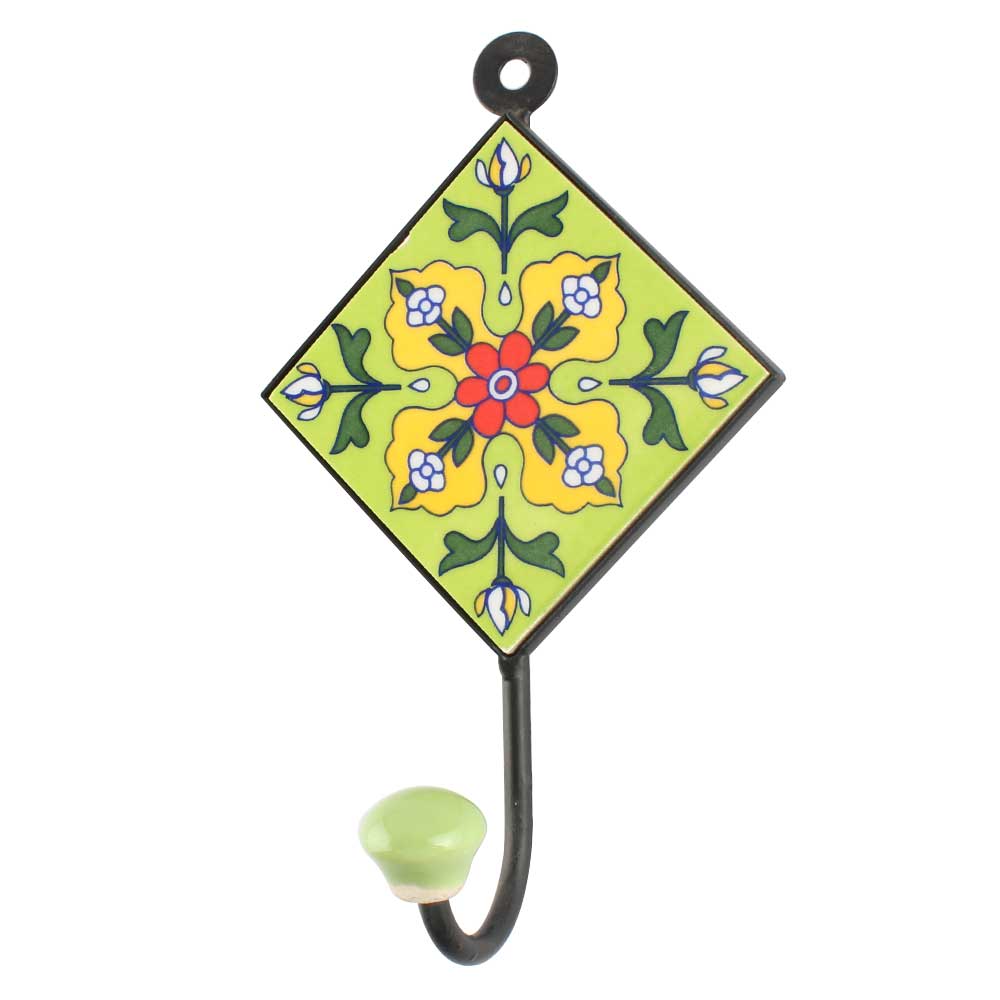 Pea Green Floral Ceramic Tile Wall Hook Online. When Put on Wall or Cabinet It is An Art in Itself. The Metal Part of this Hook is Black Powder Coated.